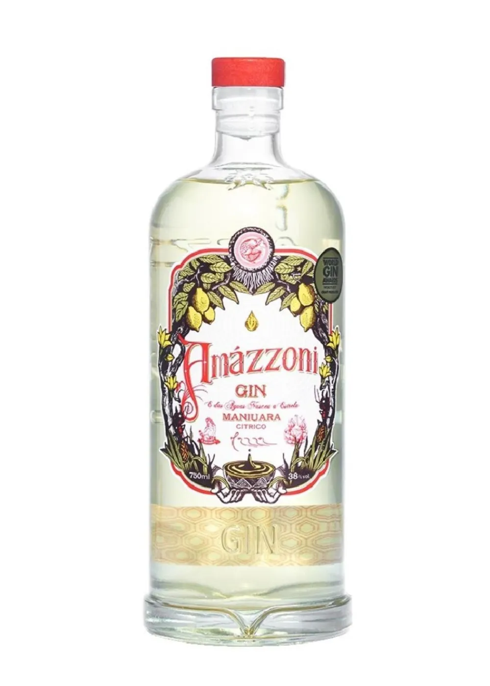 Gin Maniuara von Amazzoni ist ein exklusiver handgefertigter Gin aus Brasilien mit einem einzigartigen und authentischen Geschmack. Die schöne klare Flasche mit roten und goldenen Details sorgt für einen eleganten Look auf jedem Bartisch.
