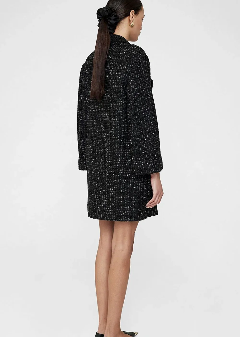 Dieses einzigartige Kleid von ist vom klassischen Blazer inspiriert, aber mit einem femininen Twist, der Selbstbewusstsein und Raffinesse ausstrahlt. Das Kleid mit dem schönen schwarz-weißen Tweed-Muster ist ein perfektes Beispiel für eine moderne Interpretation des traditionellen Blazer-Looks.