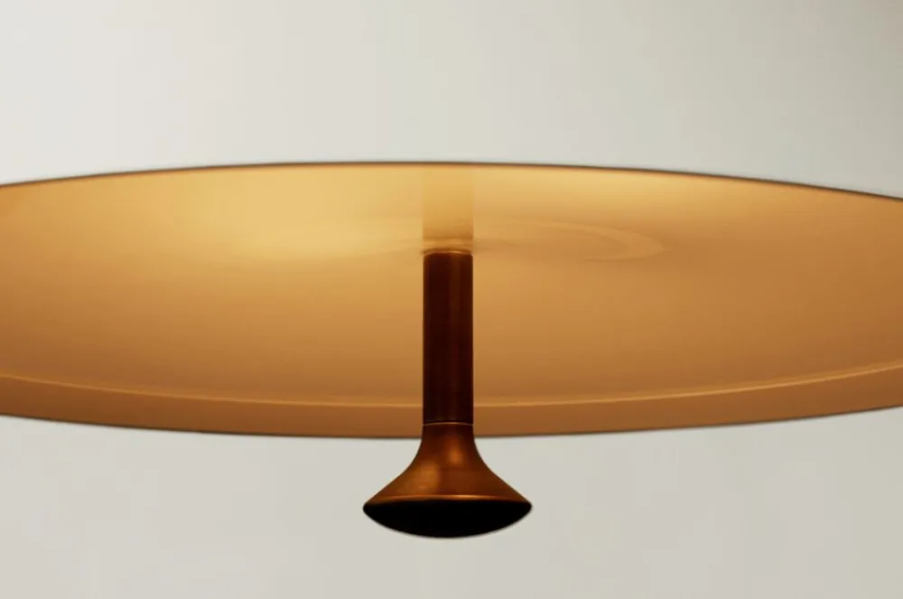 - HERSTELLUNGSVERFAHREN: Gedrehter Aluminiumschirm, handgefertigter Glasdiffusor, mit gefrästen Messingdetails.