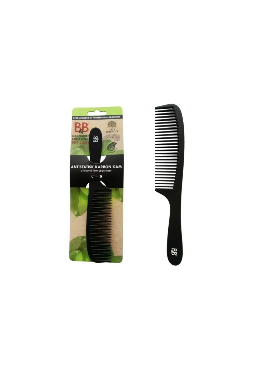 Der Carbon Cam von B&B ist kein gewöhnlicher Kamm! Er ist aus Karbon hergestellt, einem sehr haltbaren und leichten Material, das sich perfekt für den täglichen Gebrauch im Fell Ihres Hundes eignet. Der Kamm ist außerdem antistatisch, was bedeutet, dass er das Kräuseln und elektrische Haare Ihres Hundes reduziert.