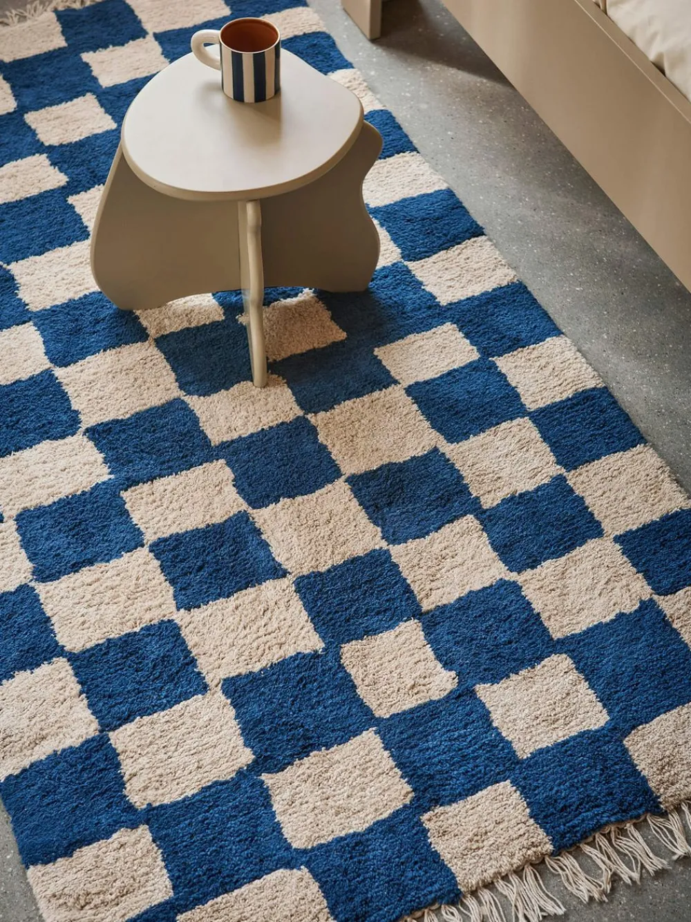 Der Knüpfteppich Mara ist eine moderne Interpretation eines klassischen Teppichs mit einem kräftigen Karomuster und dekorativen Fransen.