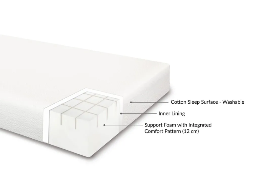 Die Schaumstoffmatratze + Baumwollbezug von wurde vom FLEXA Design Team entwickelt, um den besten Komfort und Halt für Kinder zu gewährleisten. Der 12 cm dicke Schaumstoffkern ist mit Aussparungen versehen, die für eine bessere Polsterung sorgen und eine bequeme und stützende Schlafunterlage schaffen. Der Baumwollbezug kann leicht abgenommen und gewaschen werden, was besonders praktisch ist. Die Zertifizierung nach OEKO-TEX® STANDARD 100 garantiert Qualität und gibt Ihnen die Gewissheit, dass Sie dieses Produkt für Ihr Kinderbett wählen.
