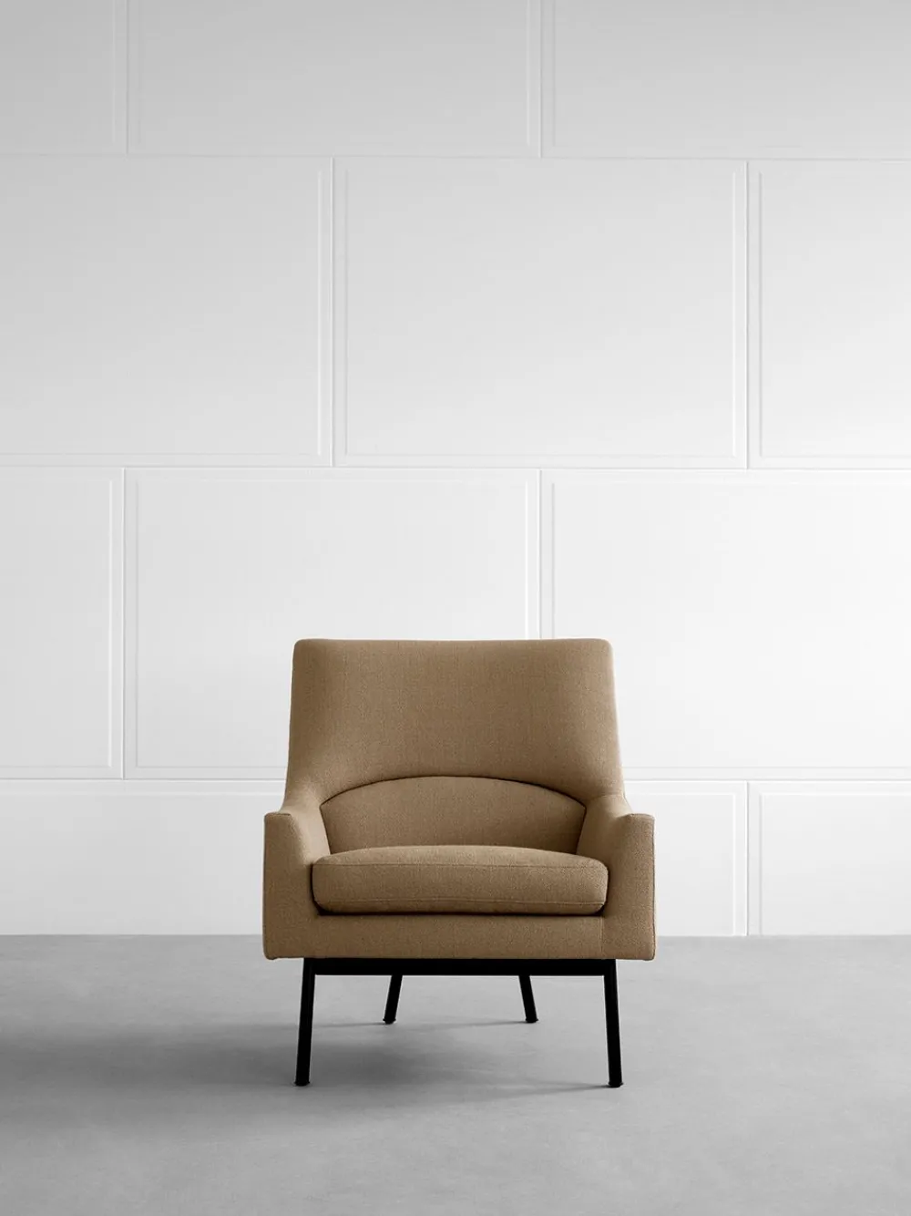 Jens Risoms „A-Chair“ ist ein perfektes Beispiel für seine skandinavisch-amerikanischen Entwürfe, die auf einer Philosophie stromlinienförmiger Formen und bescheidenen Komforts beruhen. Jens Risom gehörte zur goldenen Generation von Designern der dänischen Moderne, die sich durch außergewöhnliche Qualität in der Ausführung und bei den Materialien auszeichnete und gleichzeitig mit dem visuellen Ausdruck experimentierte. Die Schale des Stuhls besteht aus einer Kombination aus stromlinienförmigen und organischen Kurven mit einer Neigung, die dem Stuhl ein klassisches Lounge-Gefühl verleiht. Das Gestell ist aus kontrastierendem, schwarz lackiertem Stahl gefertigt, die Stuhllehne ruht auf der charakteristischen, a-förmigen Rückenlehne. Ursprünglich ein praktisches Merkmal, ist die Rückenlehne heute das charakteristische Detail des Stuhls.