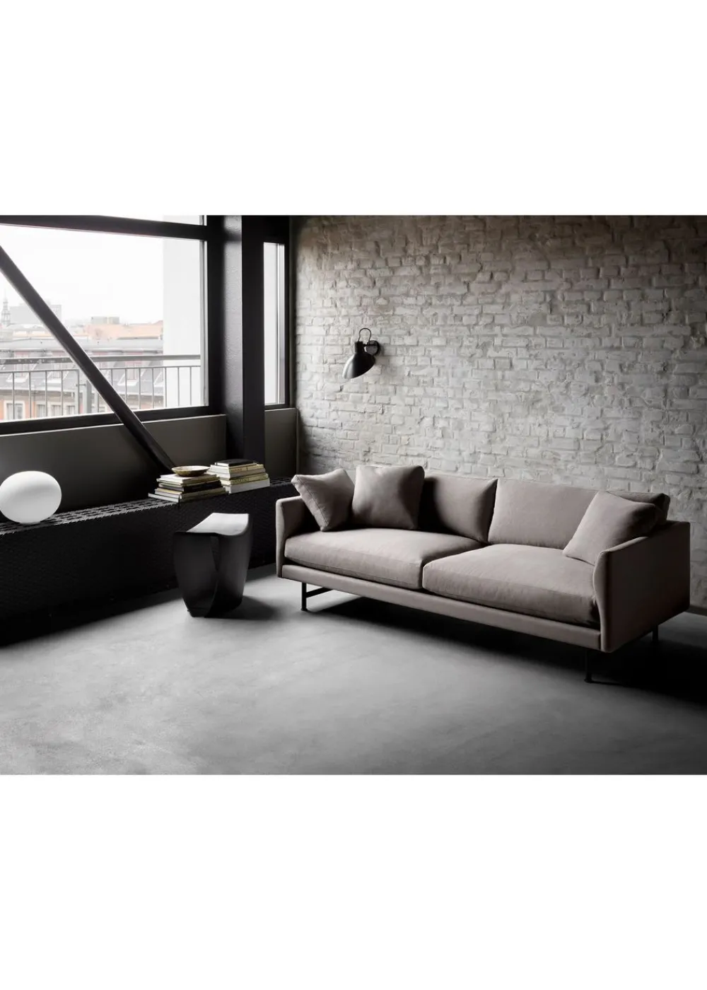 Eine massive Schale formt die Arm- und Rückenlehnen und bildet den Rahmen für den Rest des Möbels. Die Nähte der Polsterung schlängeln sich unsichtbar durch die Möbel und bilden ein subtiles, charakteristisches Detail für die gesamte Calmo“-Serie. Breite Kissen sorgen für den Komfort und das prächtige Lounge-Gefühl, das viele moderne nordische Möbel auszeichnet.
