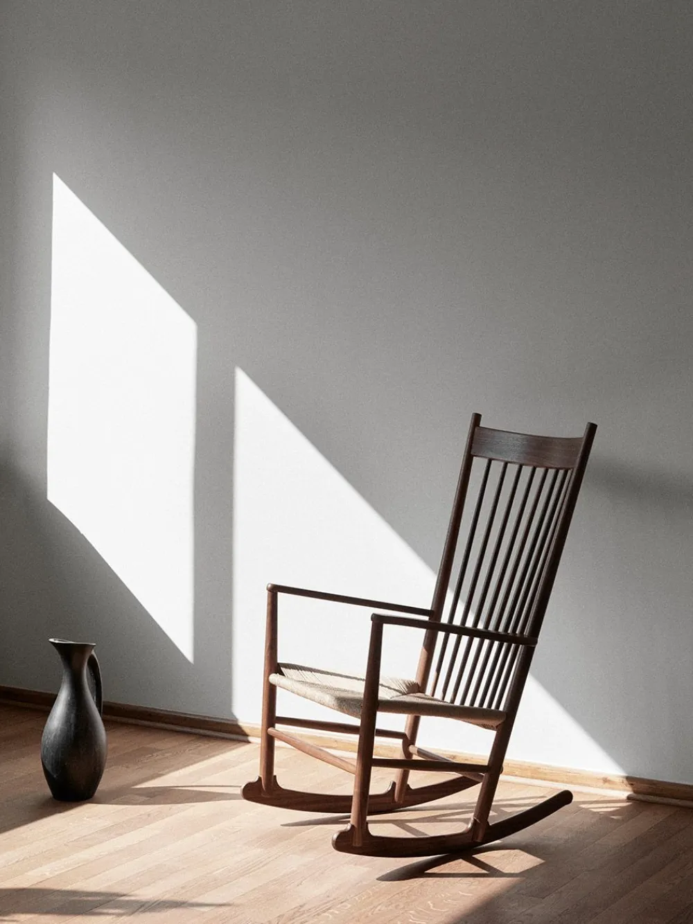 Der Schaukelstuhl J16″ ist eines der vielen Möbelstücke, die sich in Wegners Kollektion als echte Klassiker erweisen. Der Schaukelstuhl als Möbeltyp weckte schon früh Wegners Interesse, was einer der Gründe dafür war, dass der „J16“ einer der ersten Stühle war, die von Wegner in Produktion gingen. Das ikonische Möbelstück, das 1944 zum ersten Mal hergestellt wurde, feiert sein 75-jähriges Bestehen auf dem Markt, was mit einer Präsentation des Stuhls bei gefeiert wird. Bis dahin wurde der Schaukelstuhl in der Produktion angepasst, um das Herstellungsverfahren so weit wie möglich zu vereinfachen, ohne die exklusive Qualität zu beeinträchtigen. Und genau diese Qualität gewährleistet mit seiner exquisiten Tischlerei, die die Originalität der Möbel einschließt. In den 1950er Jahren war dunkles Holz für dänische Möbel besonders charakteristisch, was sich auch in der Neueinführung widerspiegelt, aber passend zur neuen Zeit ist der Schaukelstuhl jetzt auch in heller Eiche und warmem Nussbaum erhältlich.