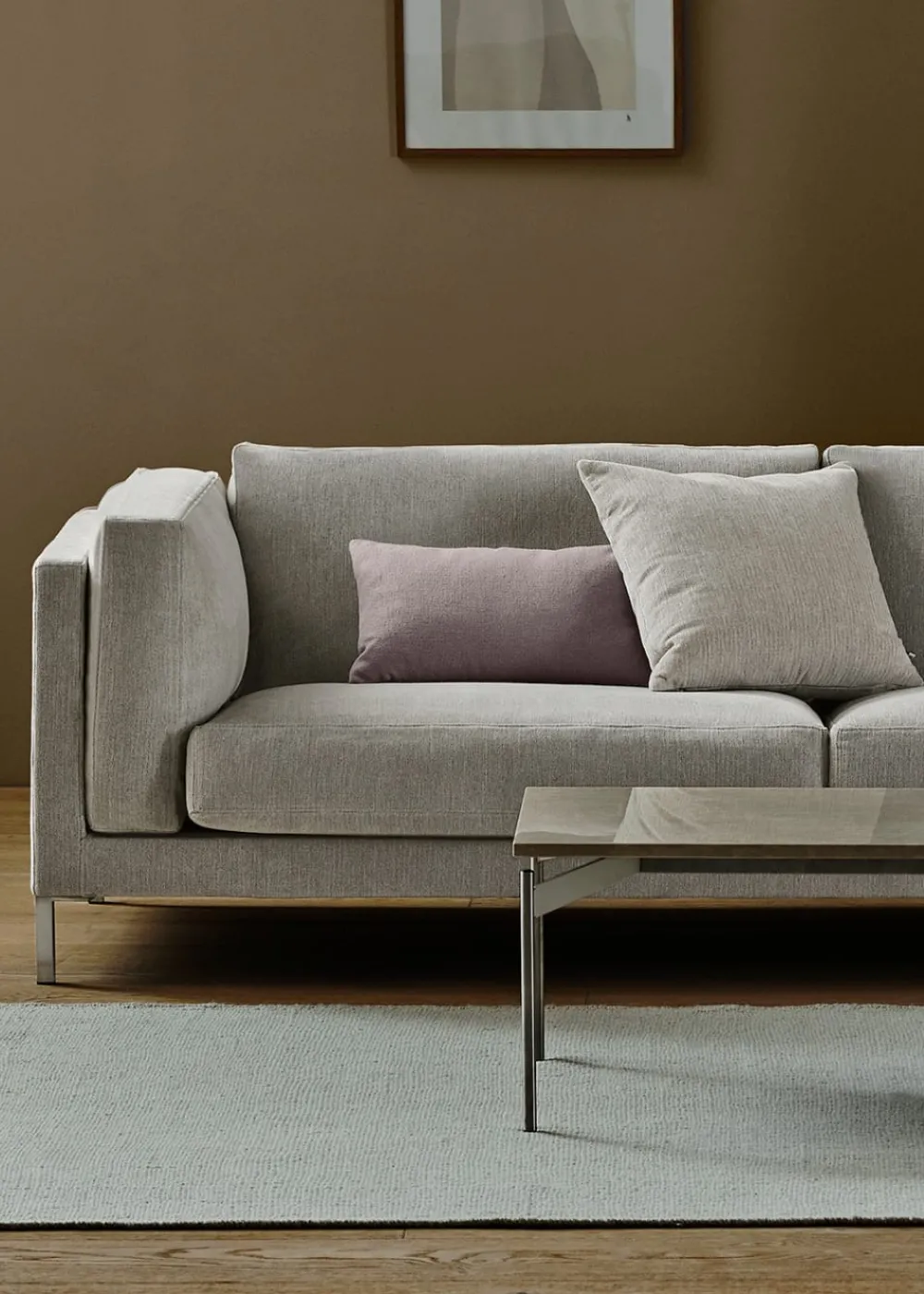 Untergestell aus Massivholz mit Sitzfederung aus Nozag-Federn, gepolstert mit Polyurethanschaum. Das Sitzkissen ist mit HR-Schaumstoff in zwei Schichten gepolstert, mit einem festeren Schaumstoff im unteren Bereich und einem weicheren Schaumstoff im oberen Bereich, der mit Fasern gefüllt ist.