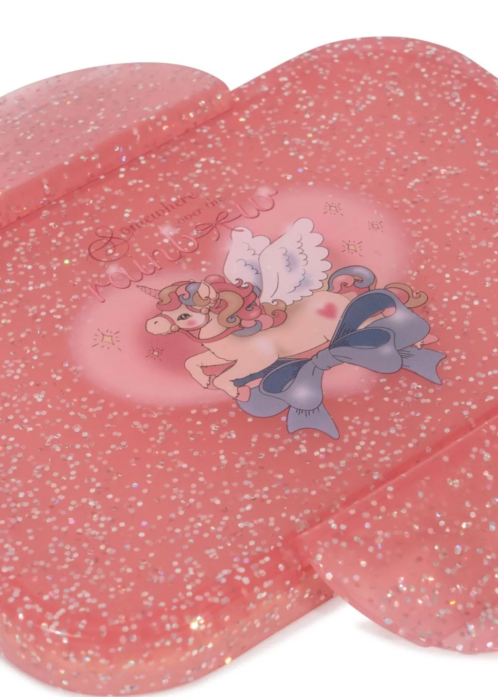Mit der hübschen Lunch Box Glitter von macht die Mittagspause noch mehr Spaß. Sie ist mit verspielten Kirschillustrationen und einem glitzernden Finish verziert, das die Blicke auf sich zieht. Aus robustem Polypropylen und Silikon gefertigt, ist sie praktisch und langlebig – perfekt für kleine Hände, die eine farbenfrohe Snackpause lieben.