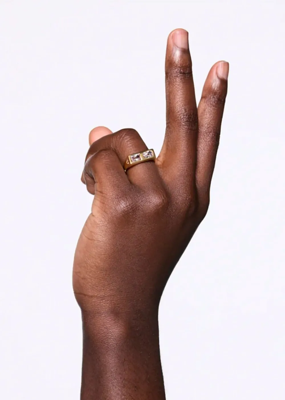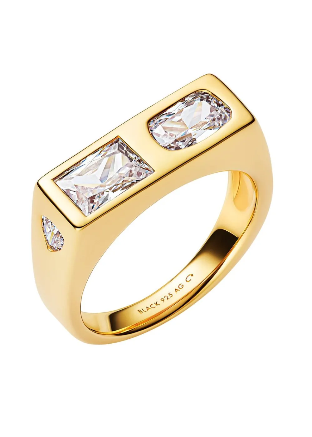 Der Us Three Signet Ring von verbindet skulpturale Eleganz mit einem starken grafischen Ausdruck. Der aus recyceltem Sterlingsilber gefertigte Ring mit exklusiver Weißrhodinierung oder 18-karätiger Vergoldung ist mit drei funkelnden Zirkonen in unterschiedlichen Formen geschmückt. Die kantige Silhouette bildet einen modernen Kontrast zu den organischen Steinen und verleiht ihm einen einzigartigen und raffinierten Look.