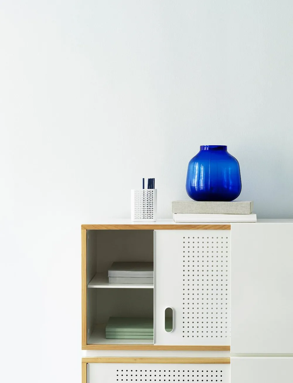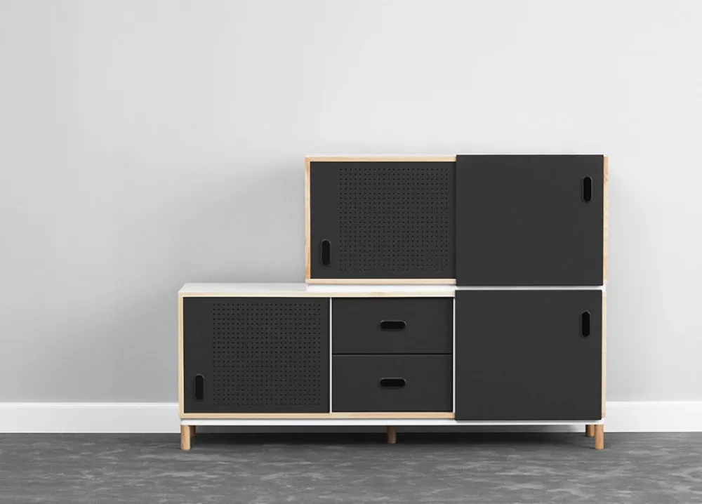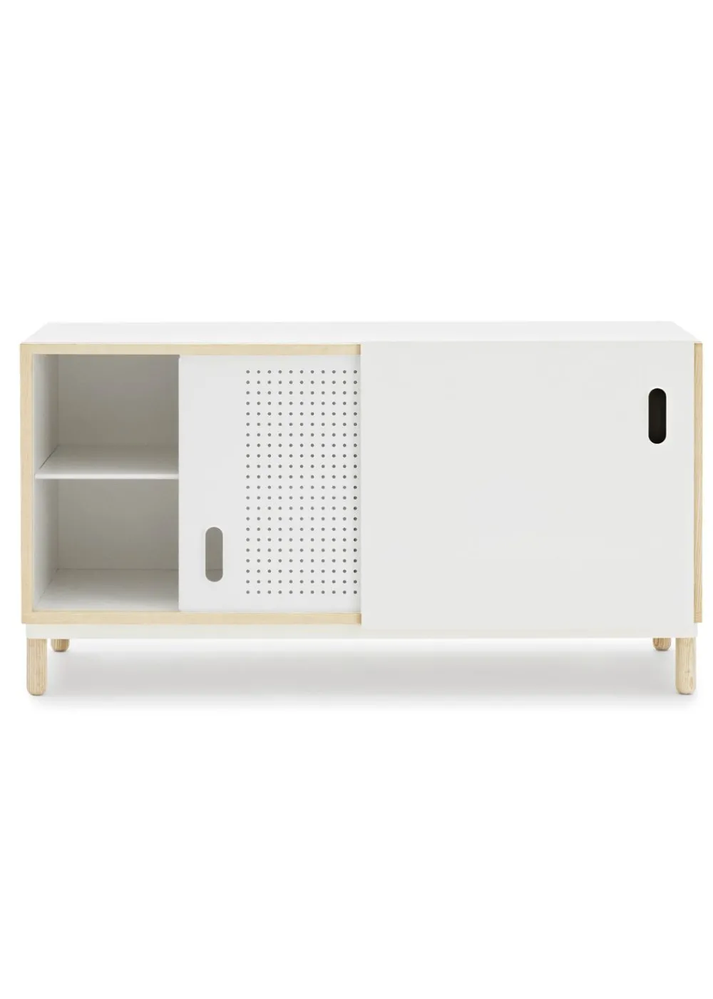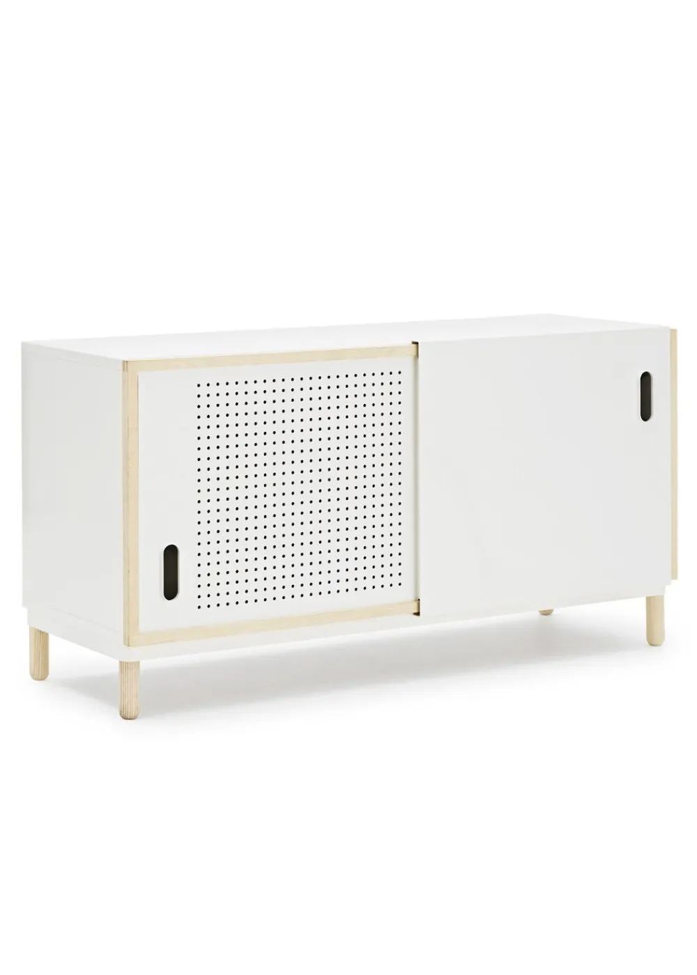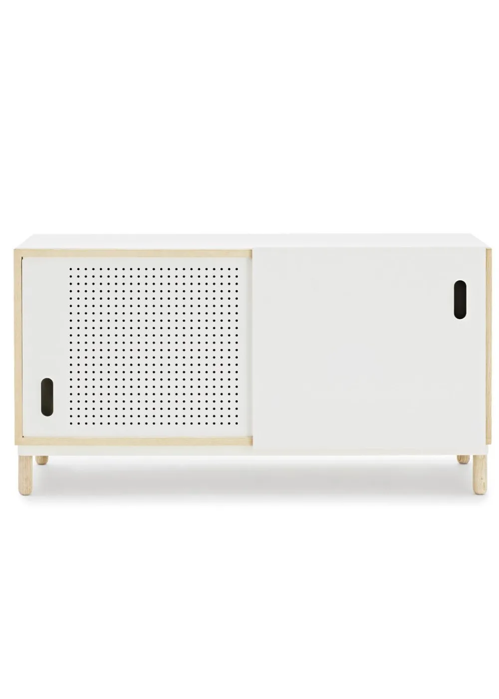 Kabino ist ein einfaches und vielseitiges Sideboard mit einem exklusiven Look. Eine der beiden Schiebetüren des Sideboards hat perforierte Löcher, die ihm eine optische Eleganz verleihen. Der Eschenrahmen macht das Gefühl weicher und sorgt für Wärme. Kabino ist ein nützliches Möbelstück für fast überall im Haus.