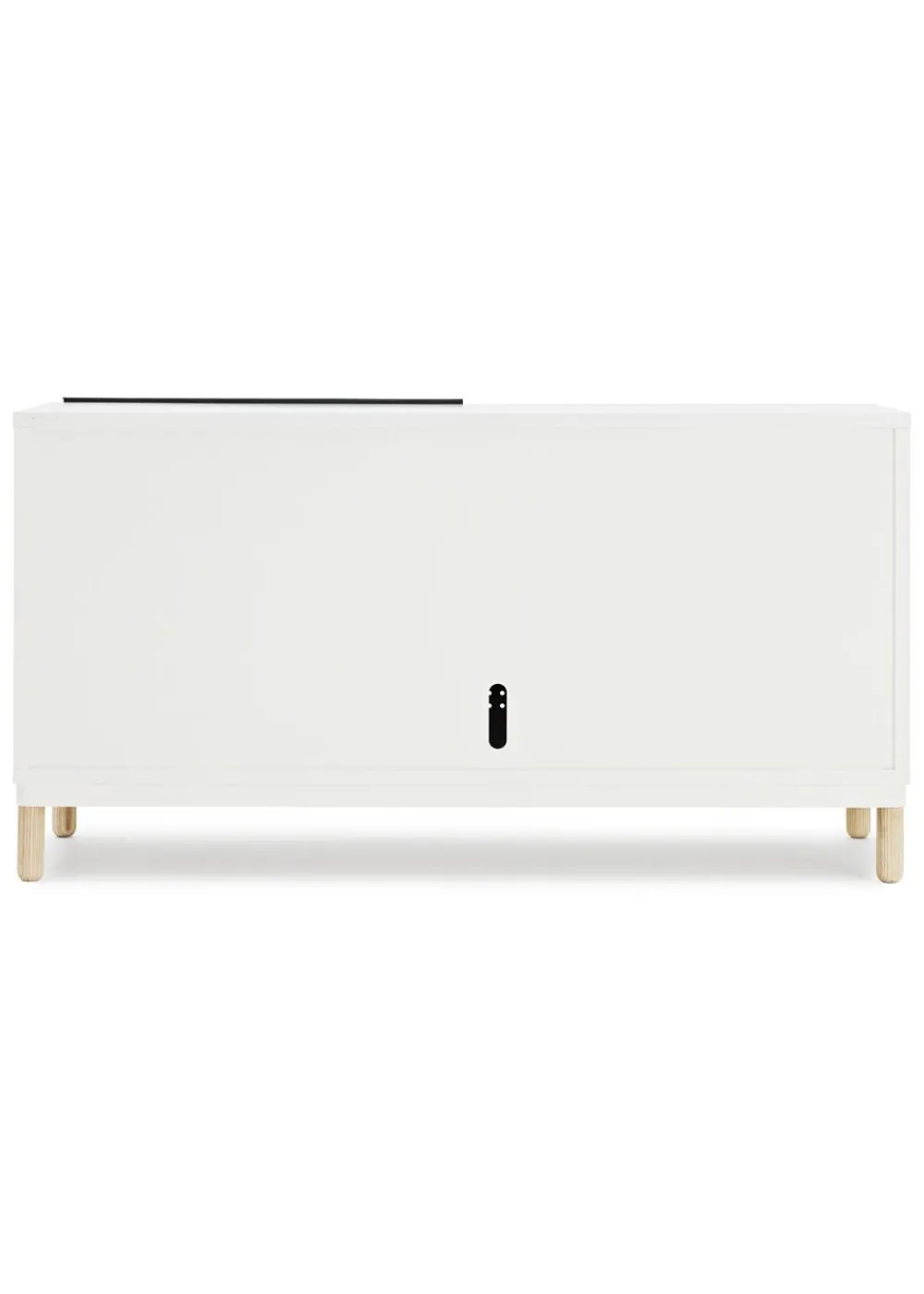 Kabino ist mit weißen oder grauen Türen erhältlich und eignet sich ideal als Sideboard im Wohnzimmer, Esszimmer, Flur oder Schlafzimmer. Durch den eingebauten Kabelausgang und die perforierten Löcher, die es ermöglichen, eine Fernbedienung auch bei geschlossenen Türen zu verwenden, eignet sich Kabino auch für den Einsatz als TV-Schrank.