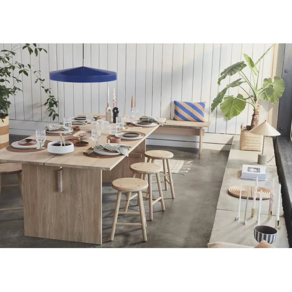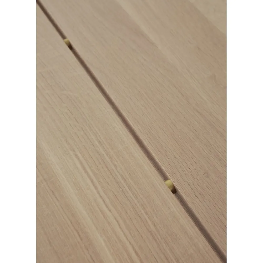 Der Kotai Tisch von ist ein zeitloser Tisch mit einem schlichten Design. Das massive, weiß pigmentierte Eichenholz bildet einen schönen Kontrast zu den dezenten, feinen Details, die an der Tischplatte, den Tischbeinen und zwischen den Tischplatten zu sehen sind. Der Tisch kann sowohl als Esstisch als auch als Bürotisch verwendet werden.