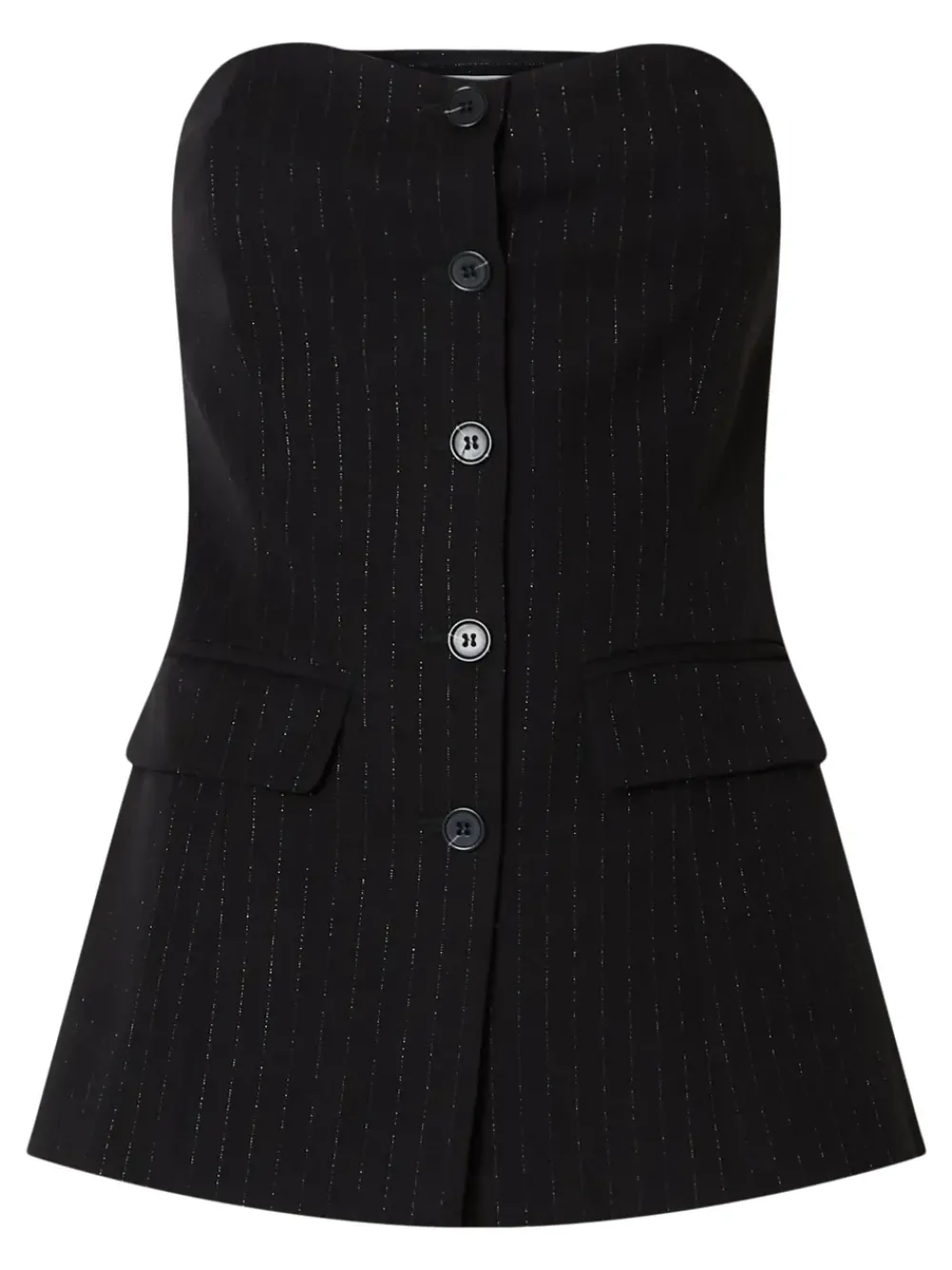 Elegantes Top mit Knöpfen in der Mitte von . Es ist in der beliebten Rita-Qualität mit eleganten silbernen Streifen gefertigt, die dieses Modell perfekt für saisonale Feste und Zusammenkünfte machen. Kombinieren Sie es mit einer Hose und einem Blazer aus der gleichen Serie, wenn Sie ein Set wünschen.