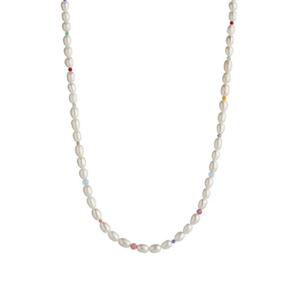 Coole und trendige Halskette mit Perlen aus weißer Süßwasserperle und kleinen Edelsteinen mit Facettenschliff.