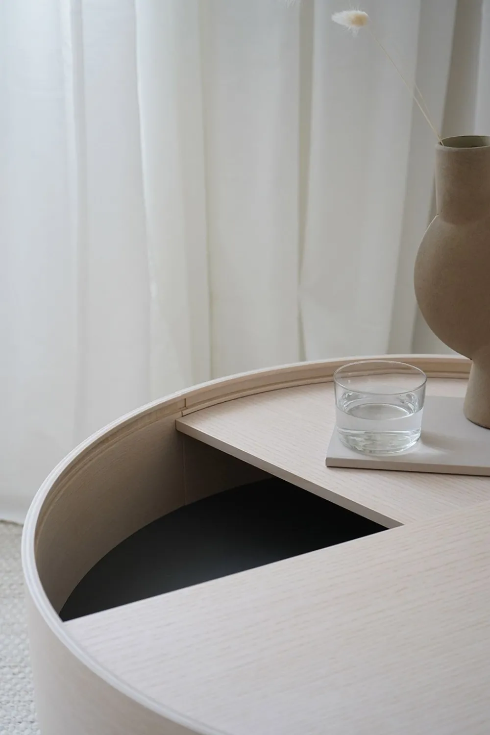 ARC Beistelltisch und Couchtisch wurden von Julie Begtrup und Ditte Vad entworfen. Der Name leitet sich von dem mathematischen Konzept einer glatten Kurve ab, die zwei Punkte in einem Kreis verbindet. Die Tische verfügen über funktionale Merkmale, die den Benutzer zur Nutzung anregen. Sie können den oberen Tisch leicht mit einem Finger öffnen. Die Tischplatte kann offen gelassen werden, um Ihre Lieblingssachen zu präsentieren, aber Sie können den Deckel auch geschlossen lassen, um die Dinge darin zu verstecken.