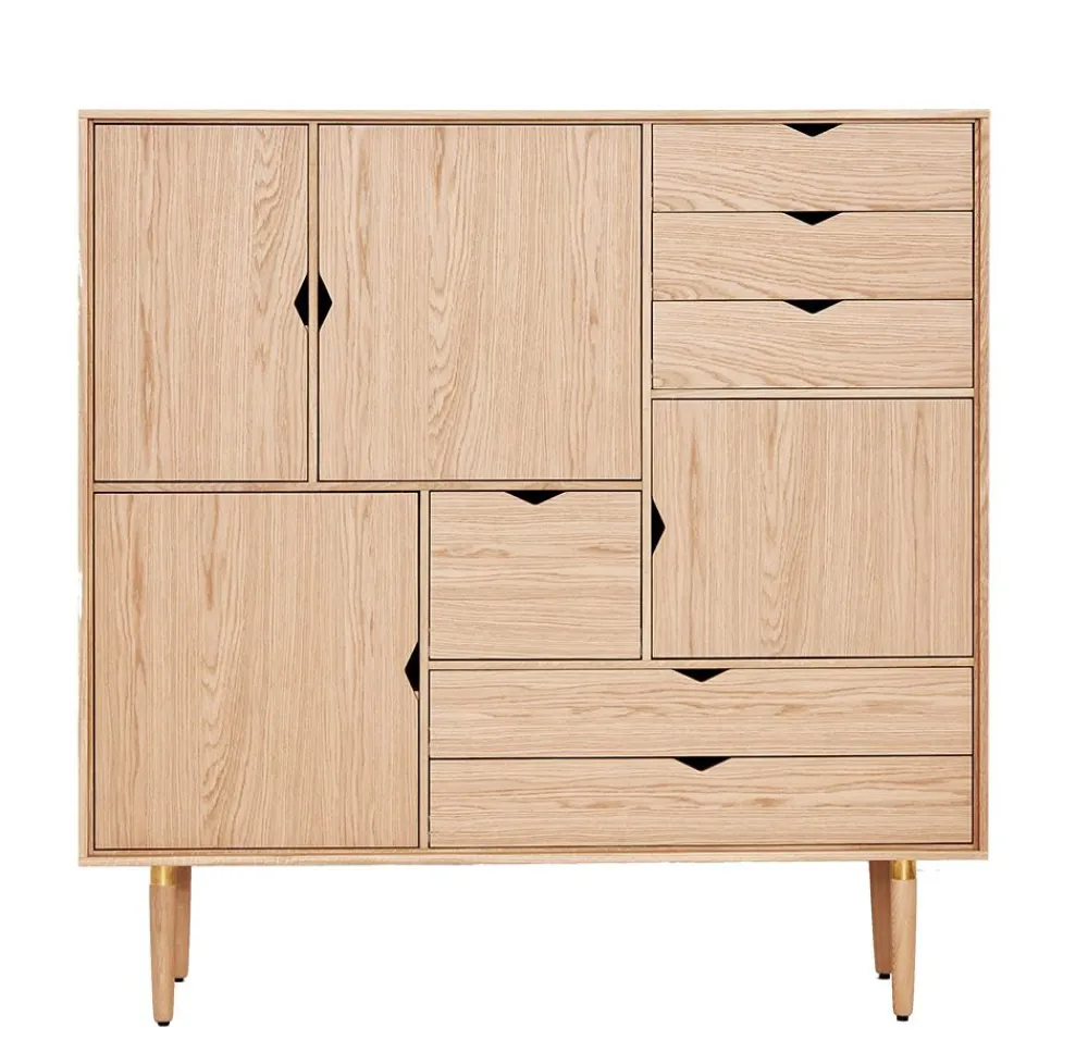 Das Highboard von Unique wurde von byKATO entworfen. Diese schöne Aufbewahrungslösung mit elegantem Design ist aus Eichenfurnier gefertigt und mit einem Korpus in weiß pigmentiert oder schwarz erhältlich. Das Highboard verfügt über drei Einlegeböden und besteht in der Regel aus einer Kombination von sowohl Einlegeböden als auch Schubladen. Das bietet reichlich Stauraum.