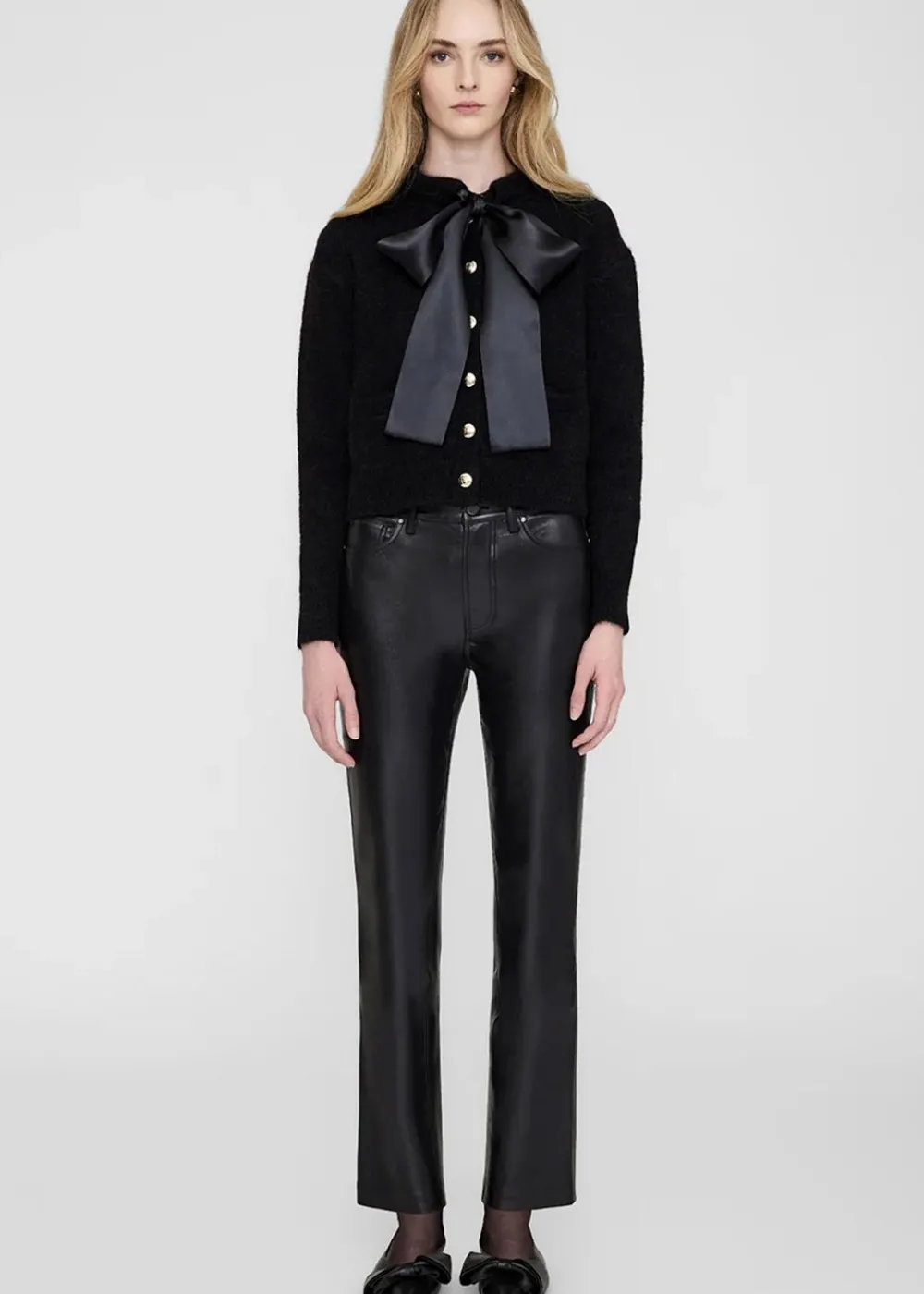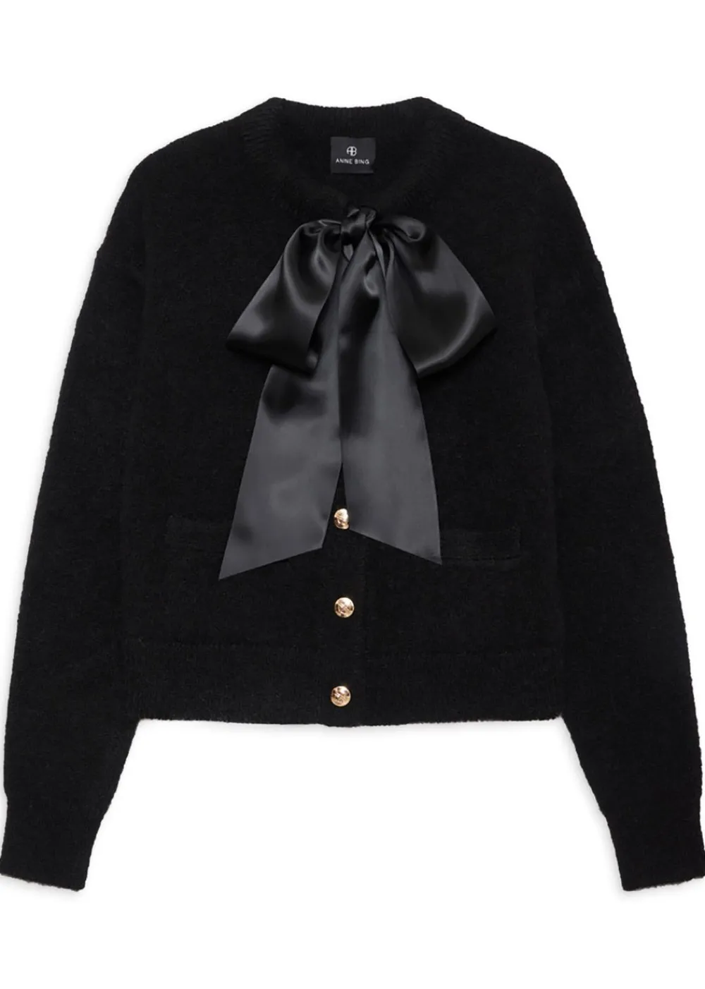 Der Rhodes Cardigan von ist aus einer weichen Alpaka-Mischung gefertigt, die für ein luxuriöses Gefühl und Textur sorgt. Der Cardigan ist mit femininen Details wie einer seidigen schwarzen Schleife und goldenen Knöpfen versehen, die der klassischen schwarzen Silhouette einen eleganten Touch verleihen.