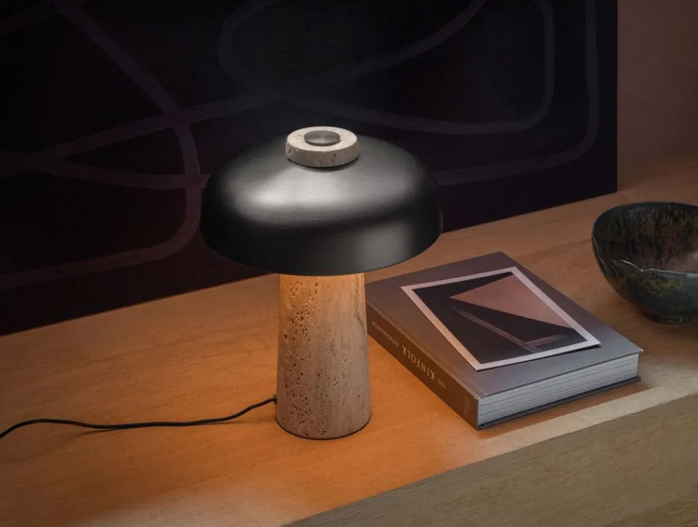 Die Lampe Reverse Table besteht aus einem schönen Sockel aus rohem Travertin mit einem Schirm aus bronziertem Messing. Der helle Stein kontrastiert mit dem dunklen Messing, das das Licht umarmt, so dass es kleine Schatten in dem rohen Travertinstein erzeugt. Oberhalb des Schirms befindet sich ein dezenter Dimmer, so dass das Licht perfekt an die Atmosphäre angepasst werden kann.