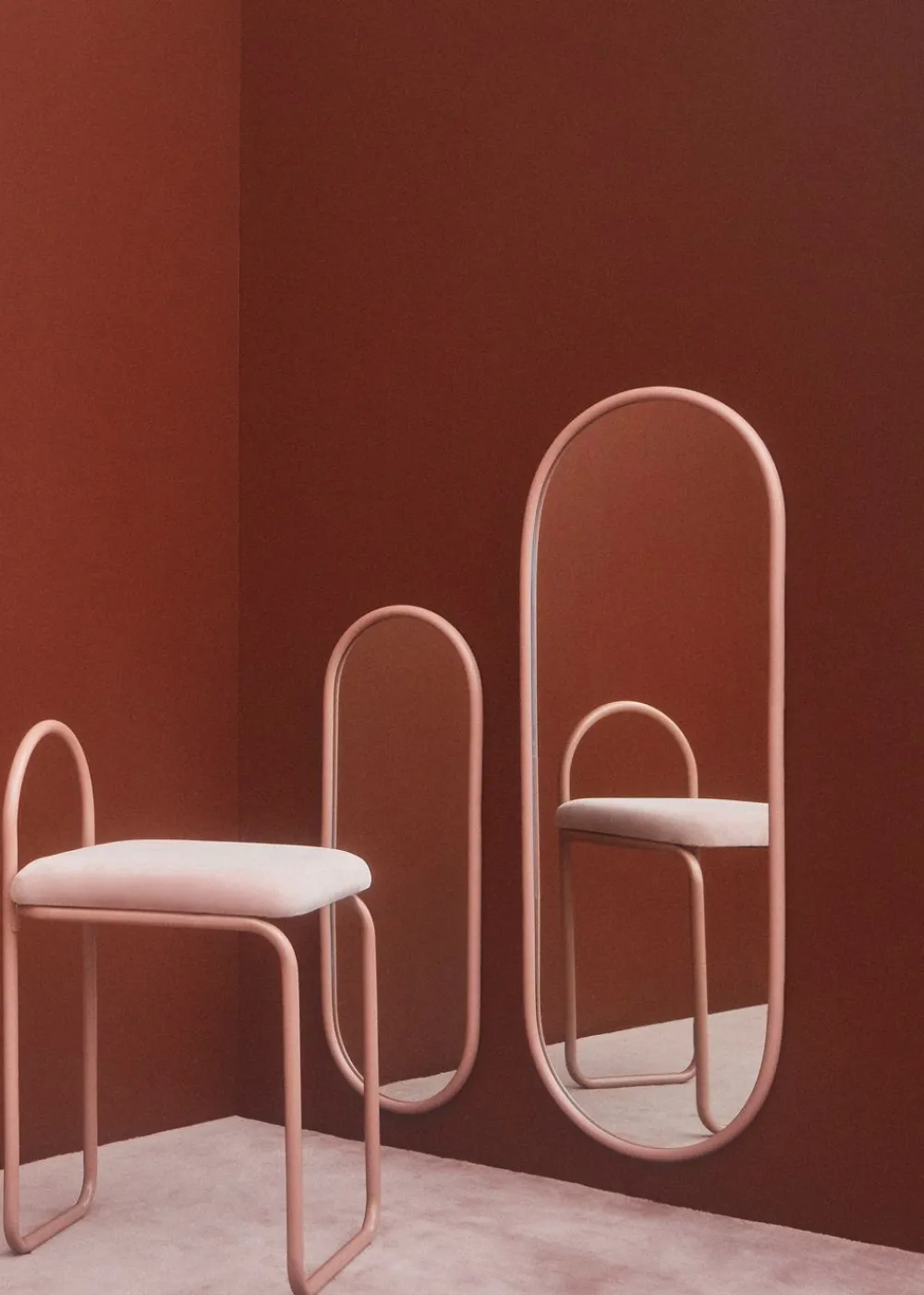 Die ANGUI-Serie von ist eine schöne und einfache Möbelserie, die sich auf weiche geometrische Formen konzentriert. Die Serie besteht aus Spiegeln, Stühlen, Bänken, Regalen und Tischen, die alle von Ovalen und weichen Kurven inspiriert sind. ANGUI ist eine einfache und stilvolle Serie, die mit ihrer großen Auswahl an Farben, Materialien und Varianten in jedes Haus passt.