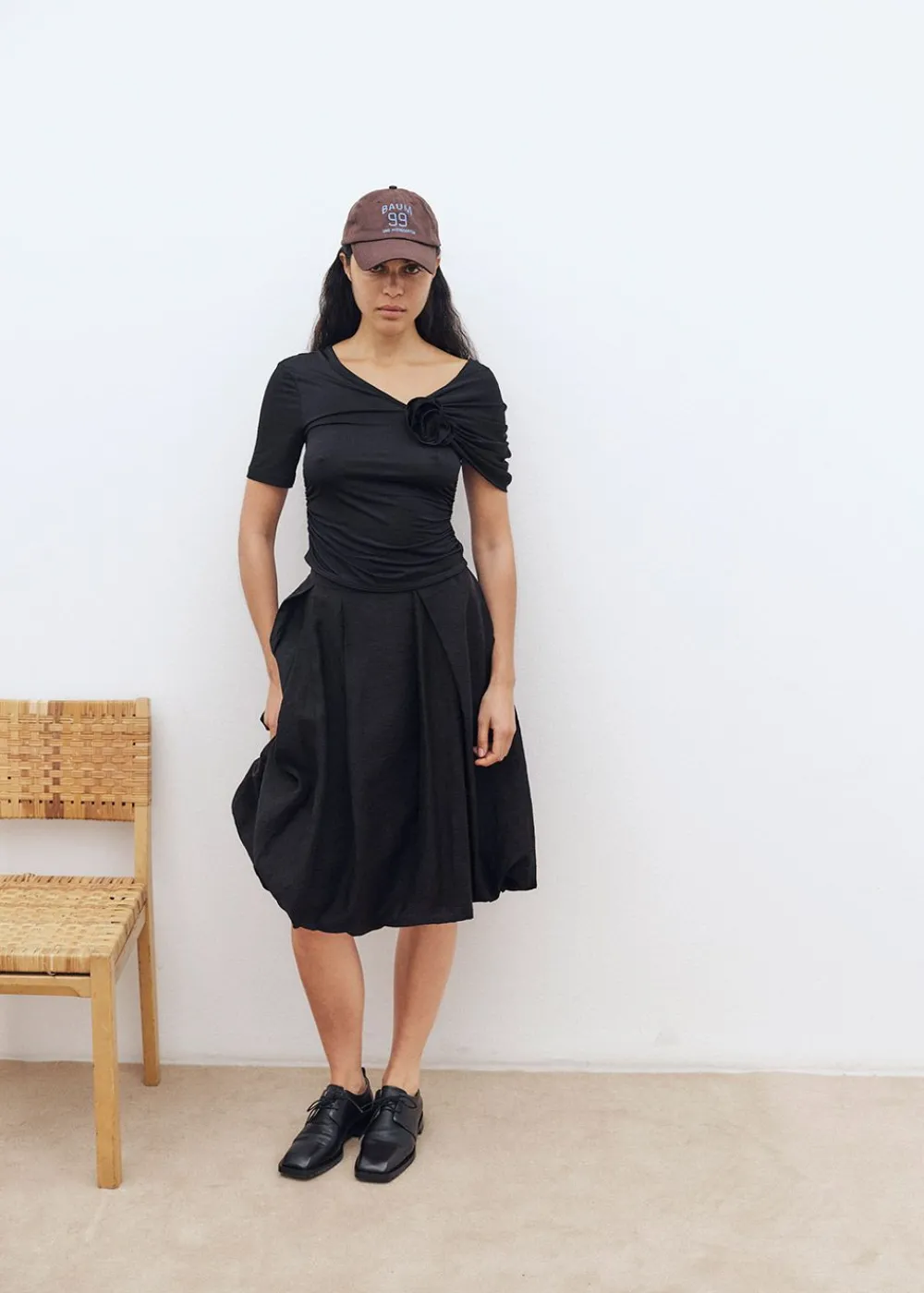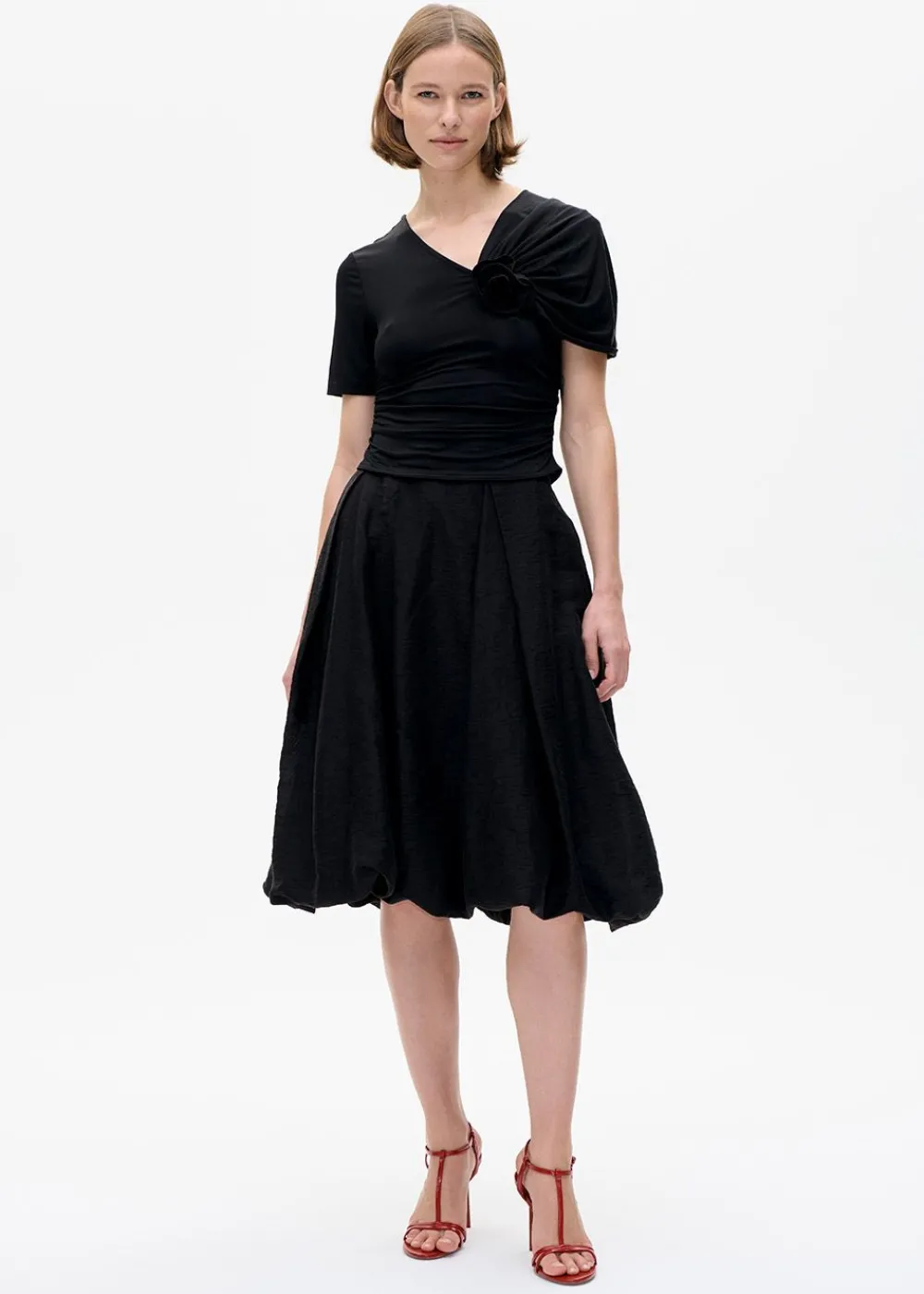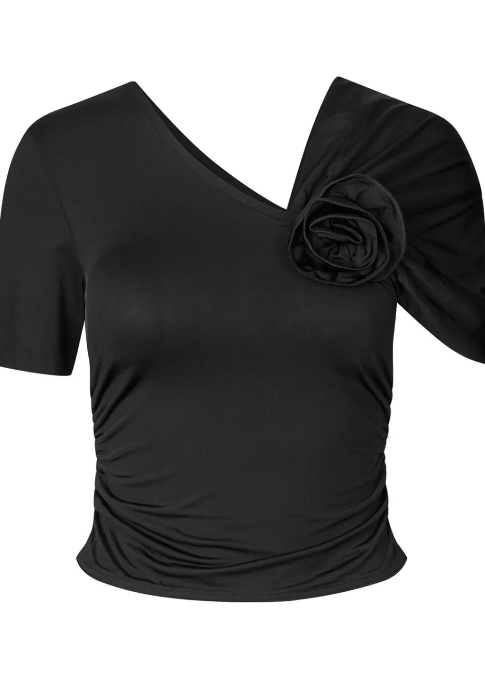 Die Bluse Jansje von verbindet klassische Eleganz mit modernen Details. Die asymmetrische Silhouette wird durch eine drapierte Schulter und eine formschöne Stoffrose betont, die einen femininen und raffinierten Akzent setzt. Der weiche, dehnbare Stoff sorgt für eine schmeichelhafte Passform, während die dezenten Rüschendetails die zeitlose Ästhetik der Bluse unterstreichen.