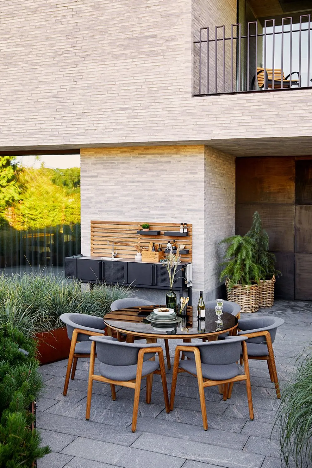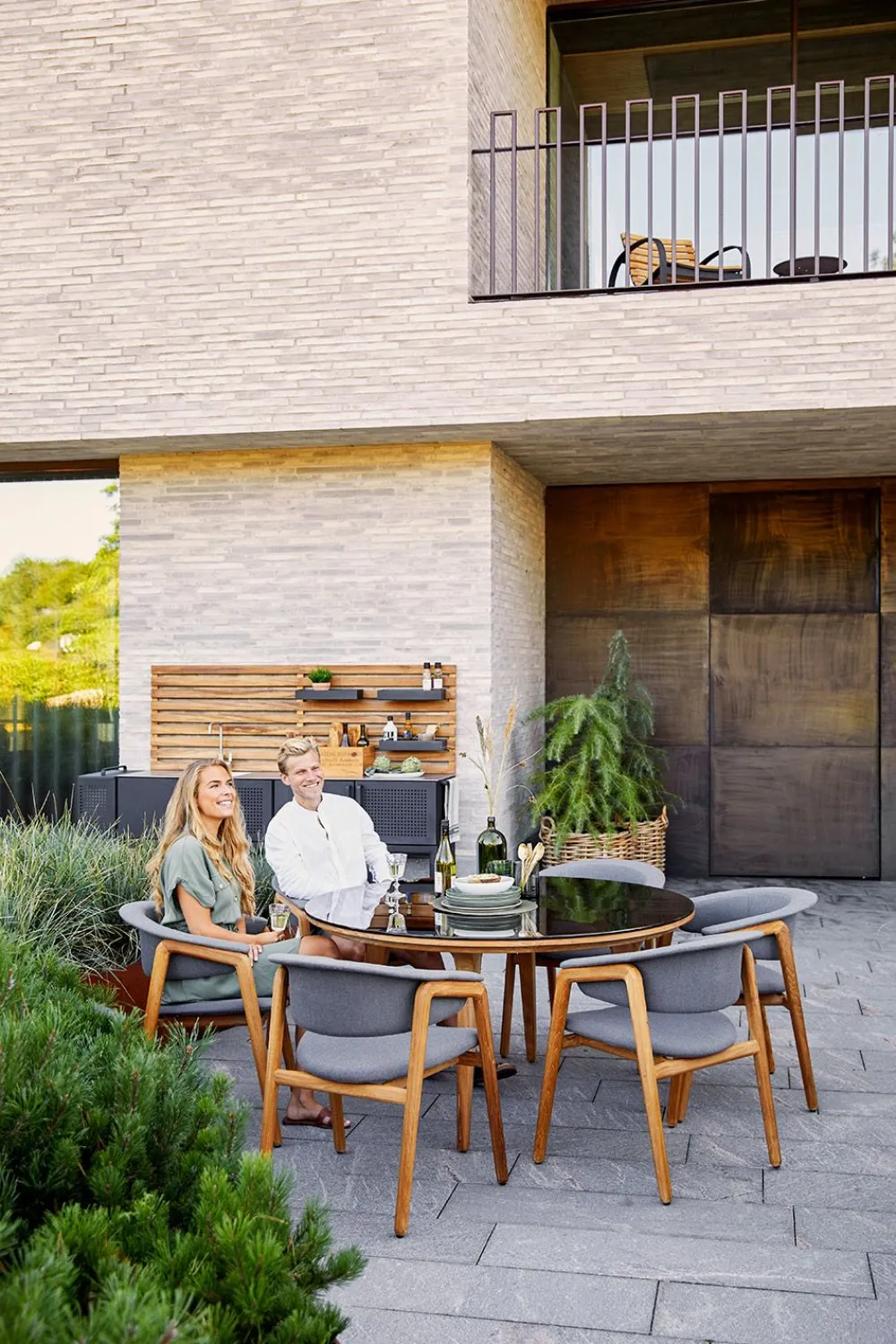 Die Aspect-Tische sind von entworfen. Die Tische werden mit einem Gestell aus Teakholz hergestellt. Die Tischplatte ist in Keramik oder Glas erhältlich. Das Tischgestell aus Teakholz bildet einen schönen Kontrast zu der Rohheit der Keramik der Tischplatte. Diese Tische sind für den Außenbereich gedacht und eignen sich perfekt für einen Lounge-Bereich auf der Terrasse. Das Teakholz kann unbehandelt belassen werden, aber wenn Sie die ursprüngliche goldbraune Teakholzfarbe erhalten wollen, können Sie es mit Teak Care behandeln.