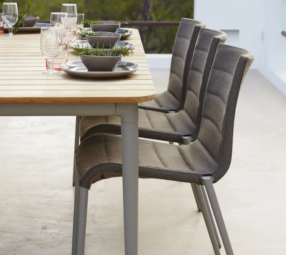 Der schöne Gartentisch Core von ist ein moderner Teakholztisch. Das Gestell ist aus starkem Aluminium, und die Tischplatte besteht aus Teakholz-Latten. Das Teakholz von ist nach dem SVLK-Zertifizierungssystem geprüft und gewachsen. Sie können den Core-Tisch unbehandelt lassen. In diesem Fall bekommt der Tisch mit der Zeit eine schöne graue Patina und muss nur minimal gereinigt werden. Alternativ kann die Tischplatte gereinigt und mit einem geeigneten Teaköl geölt werden. Je nach Klima, in dem das Sofa steht, muss der Tisch mindestens zweimal im Jahr geölt werden. Der Kerntisch ist in verschiedenen Größen erhältlich und passt gut zu vielen unserer Esstischstühle.
