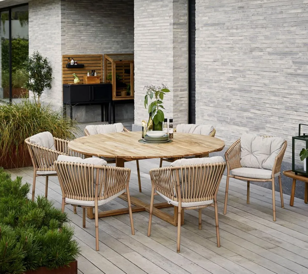 Teak ist ein ölhaltiges Holz, das perfekt für den Außenbereich geeignet ist. Das Holz erhält mit der Zeit eine natürliche silbergraue Patina. Durch die Verwendung von Teaköl kann der Tisch jedoch seinen natürlichen Glanz beibehalten. Teakholz ist gemäß SVLK-Zertifizierung geprüft und gewachsen
