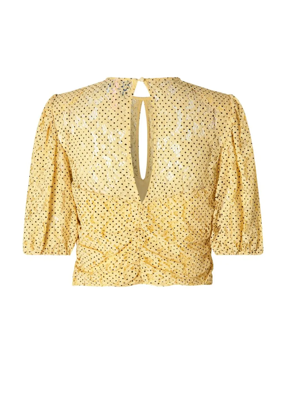 Schöne Bluse von Crás. Die Bluse hat einen Crop-Effekt, leicht gepuffte Ärmel und einen tiefen Ausschnitt mit Schlüssellochverschluss vorne und hinten.