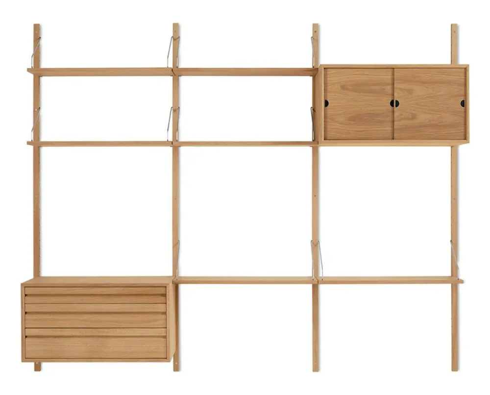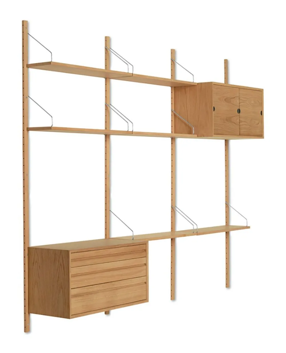 Das innovative und originelle ROYAL SYSTEM® wurde 1948 von dem legendären dänischen Designer Poul Cadovius entworfen. Das ROYAL SYSTEM® von Poul Cadovius war eines der ersten wandhängenden Regalsysteme der Welt und kann heute als einer der größten Erfolge des dänischen Möbeldesigns überhaupt bezeichnet werden. Der Grund, warum er das Regalsystem an die Wand hängen wollte, war folgender: „Die meisten von uns leben am unteren Ende eines Platzes. Wenn wir die Wände als Verlängerung des Fußbodens herunterlassen, bekommen wir viel Platz zum Leben. 2010 hat das ROYAL SYSTEM® von Poul Cadovius mit demselben zeitlosen Geist in Eiche und Nussbaum neu aufgelegt. Der zeitlose Geist wurde bewahrt, indem die vertrauten Regale, Bügel und Schränke in einer brandneuen, prächtigen Tischlerqualität beibehalten wurden. ROYAL SYSTEM® wurde für die moderne Innenraumgestaltung und zukünftige Anforderungen entwickelt und kann bis zu 16 Millionen individuelle Konfigurationen erstellen.