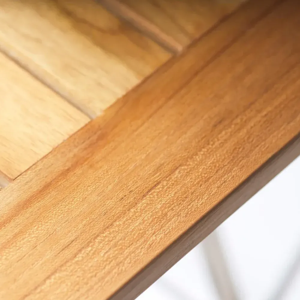 - Materialien: Teakholz und rostfreier Stahl.