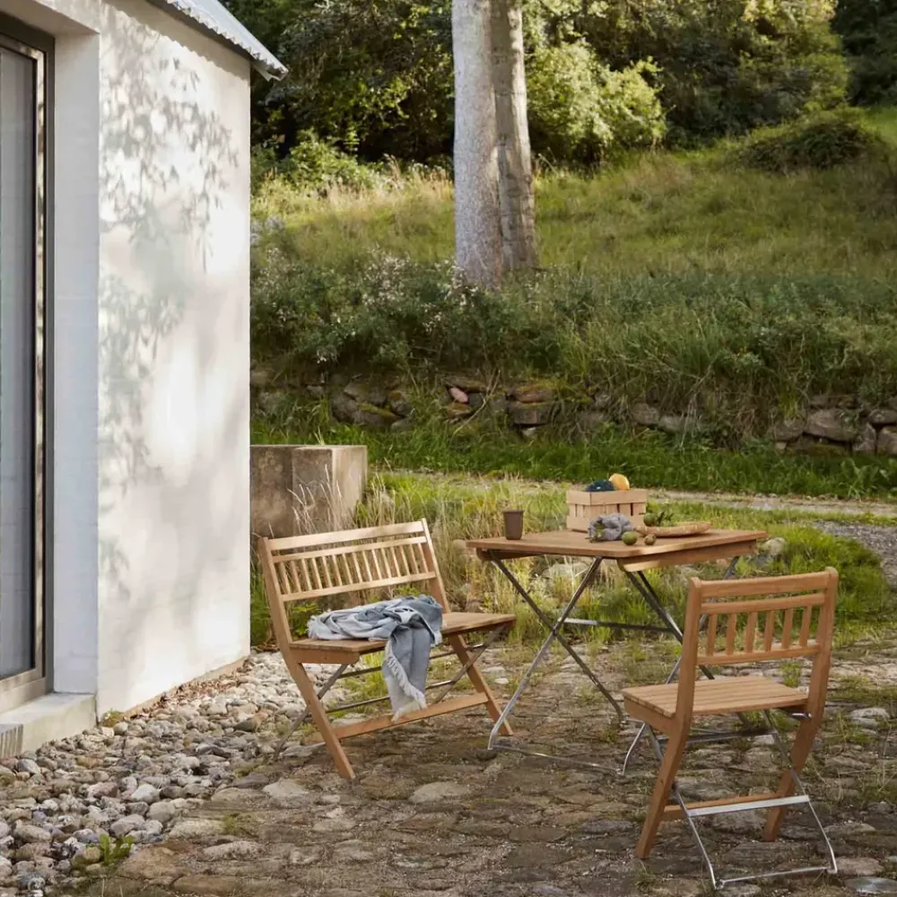 Der Lilleø Outdoor-Tisch ist sowohl funktional als auch stilvoll und damit eine perfekte Lösung für kleine Räume. Er lässt sich leicht in eine Reihe von Einrichtungsstilen integrieren, von modern bis klassisch, und kann mit anderen Möbeln der Sammen-Serie für einen harmonischen Außenbereich kombiniert werden. Der Tisch ist ideal, um auf Balkonen, Terrassen oder kleinen Innenhöfen eine gemütliche Atmosphäre zu schaffen. Das elegante Teakholz und der rostfreie Stahl machen den Tisch sowohl praktisch als auch dekorativ.