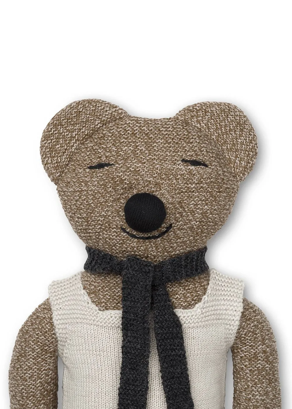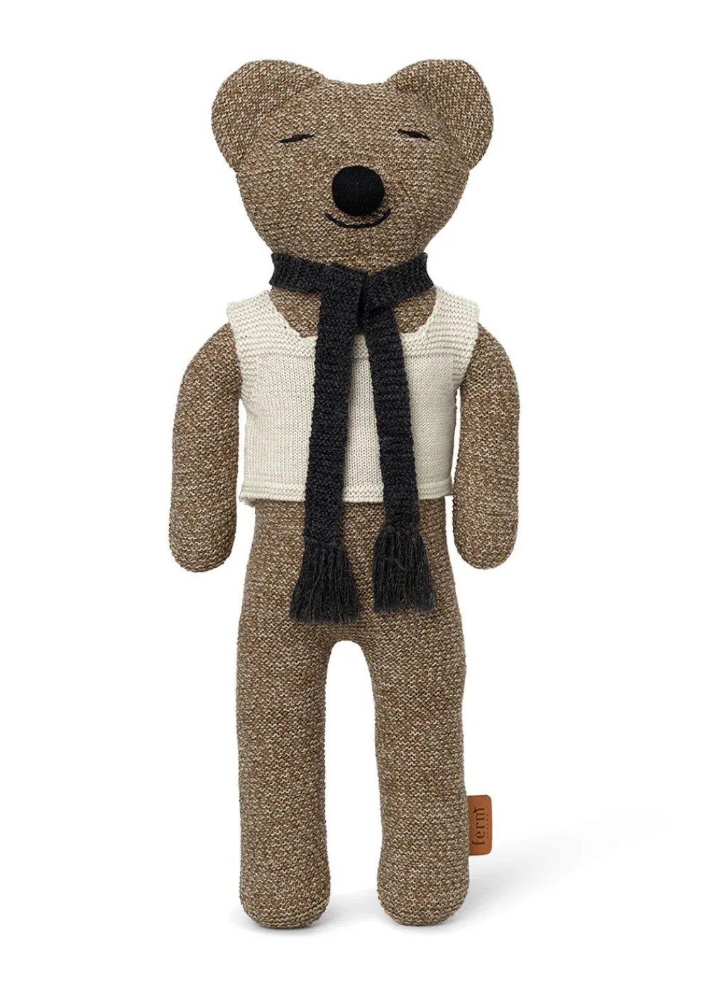 Der niedliche und freundliche Teddybär ist immer bereit, ein kuscheliger Freund für Ihr Kind zu sein. Der Bär ist mit einer kleinen Strickweste und einem hübschen kleinen Schal bekleidet. Er ist immer bereit für Spiel und Spaß. Der weiche Teddybär ist aus weicher Merinowolle aus Neuseeland gefertigt und mit recyceltem Polyester gefüllt.