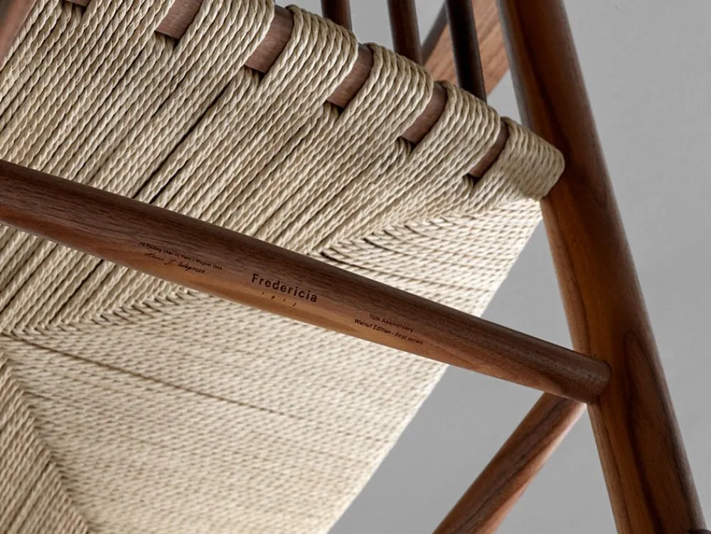 Was den „J16“ so lebensfähig macht und warum er auch heute noch sehr gefragt ist, ist Wegners einzigartiges Gefühl für Proportionen und Qualität. Die Rückenlehne des Stuhls steht im Mittelpunkt des Möbelstücks. Die horizontalen Linien stützen den Rücken und sorgen für Komfort und visuelle Ästhetik. Das gesamte Gestell des Stuhls ist aus Massivholz in vielen schönen Lackierungen und Bearbeitungen gefertigt, wodurch ein komplettes und fließendes Aussehen entsteht. Die Sitzfläche ist aus geflochtenem Papiergeflecht gefertigt, ein Merkmal, das bei vielen großen dänischen Möbelarchitekten zu finden ist. Das Geflecht erzeugt ein wunderschönes Muster, das sich im Laufe der Patinierung des Möbels verändert und anpasst. Auch der Komfort kommt nicht zu kurz: Die geneigten Proportionen, die hohe Rückenlehne und die Armlehnen sorgen für optimalen, entspannenden Sitzkomfort.