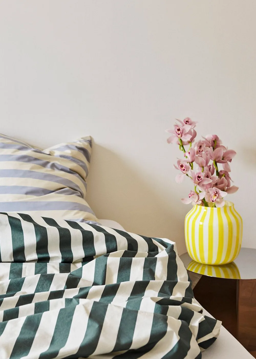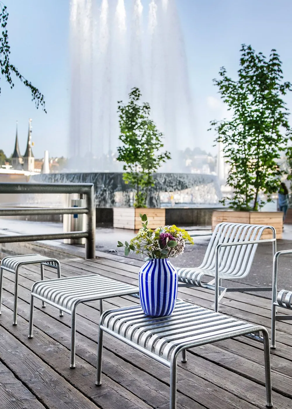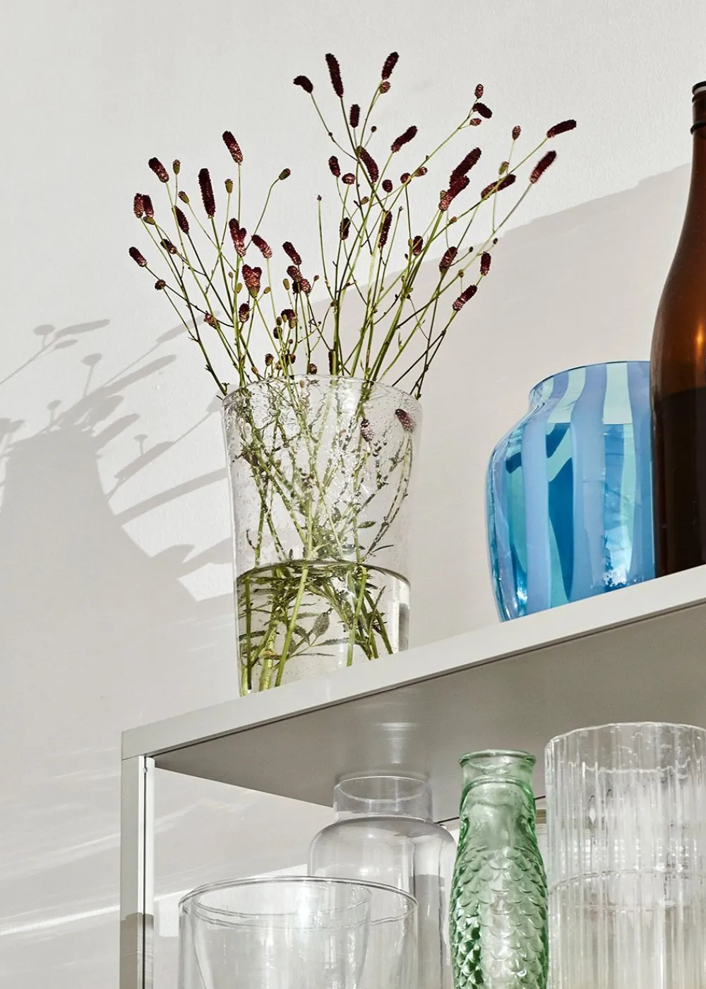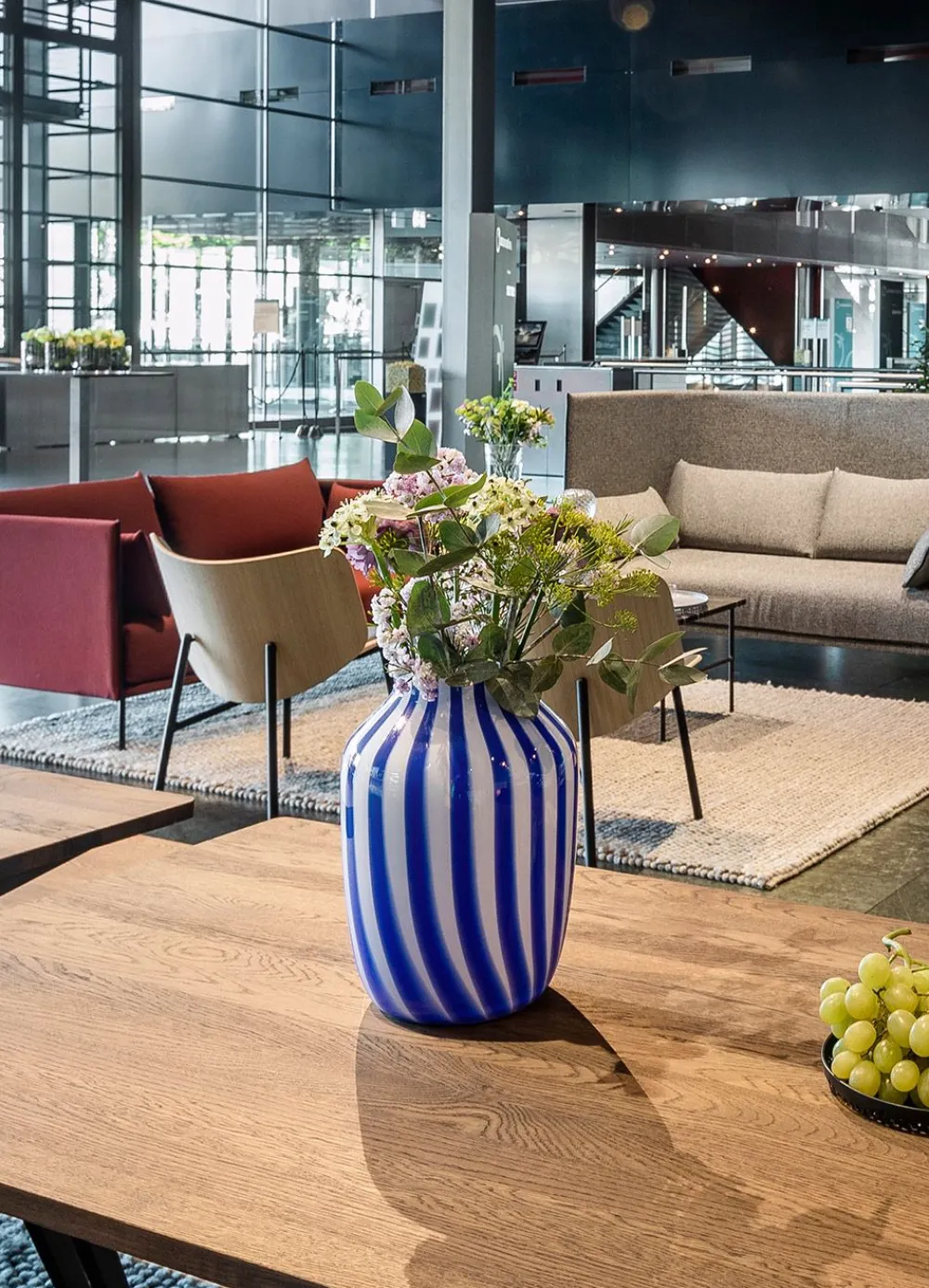 Die Kollektion der Saftglasvasen wurde von Kristine Five Melvær entworfen. Die vertikalen klaren Streifen erzeugen eine subtile Farbvariation in der Serie. Die Vasen sind in zwei Größen in drei verschiedenen Farbkombinationen erhältlich.