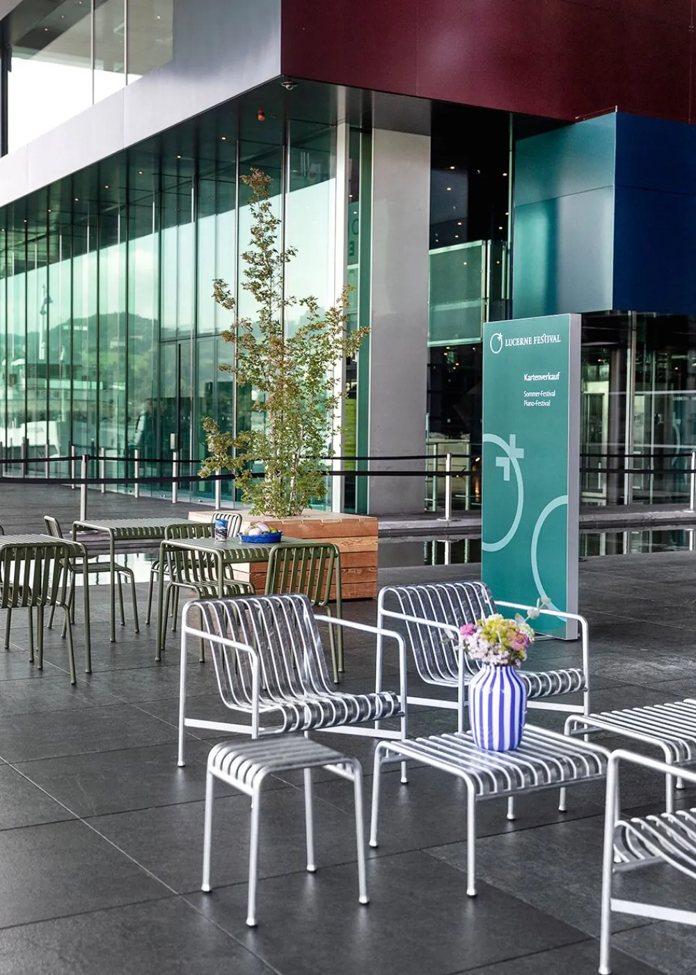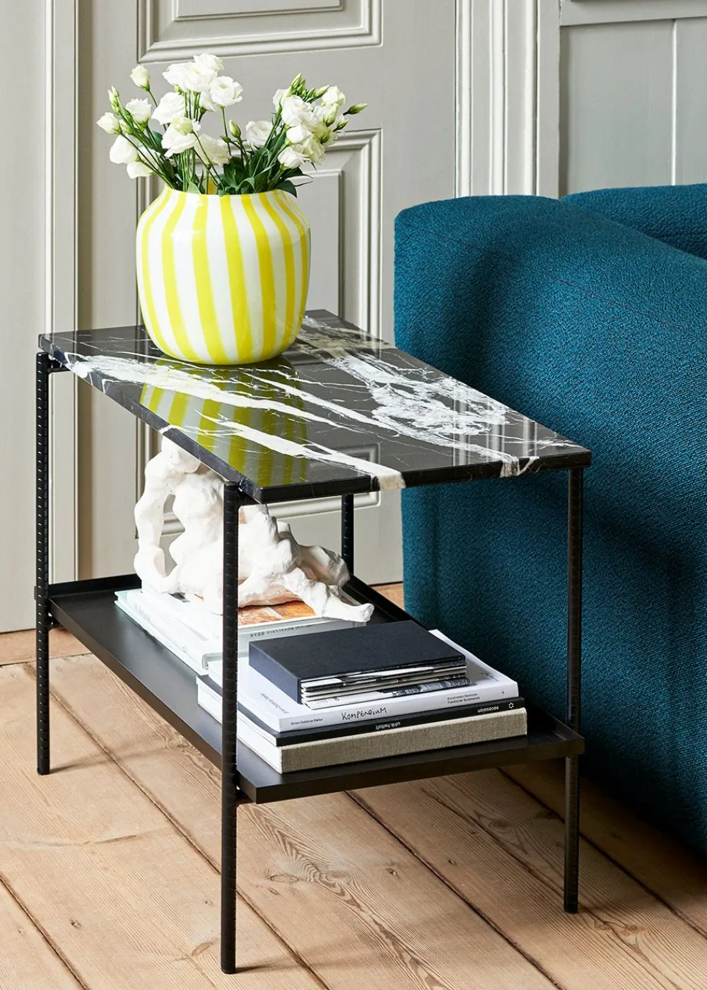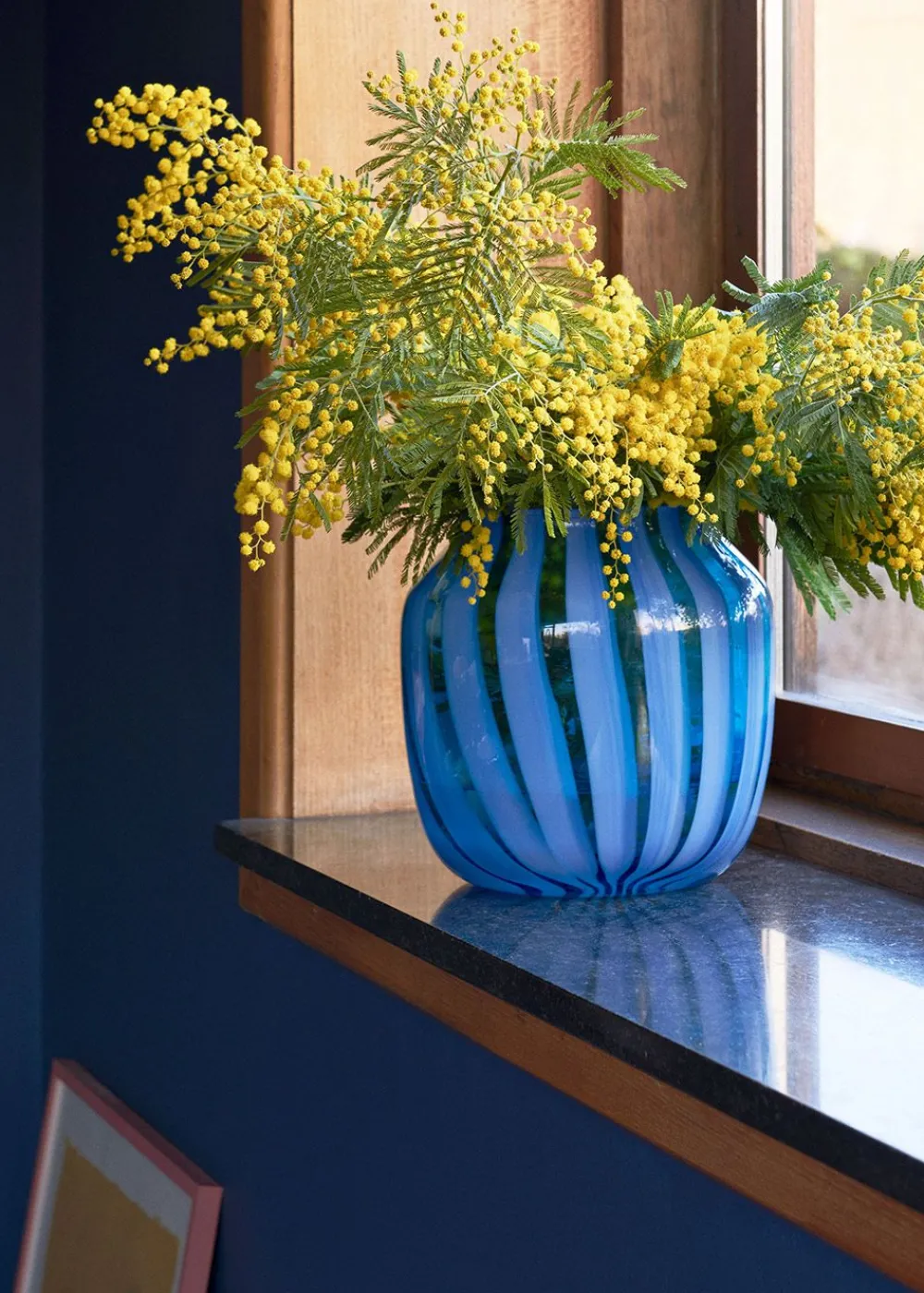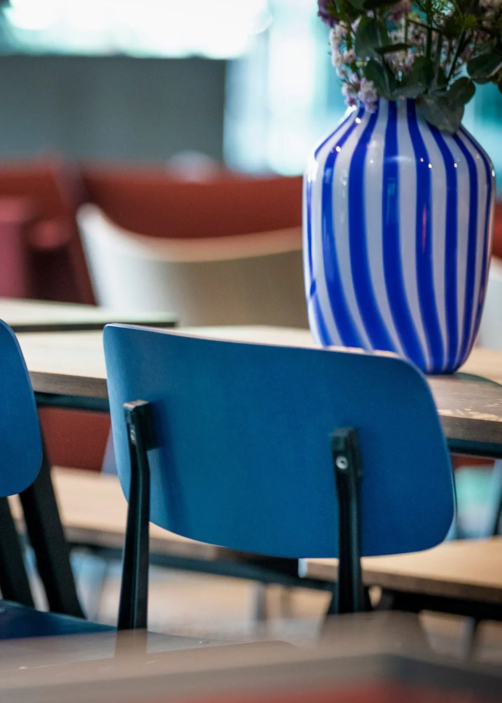 Die Kollektion der Saftglasvasen wurde von Kristine Five Melvær entworfen. Die vertikalen klaren Streifen erzeugen eine subtile Farbvariation in der Serie. Die Vasen sind in zwei Größen in drei verschiedenen Farbkombinationen erhältlich.