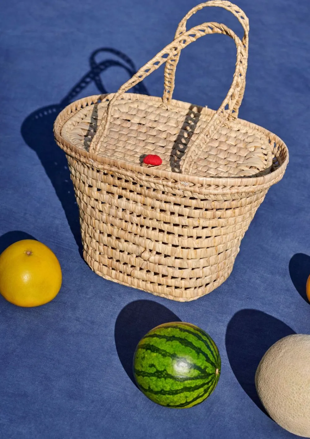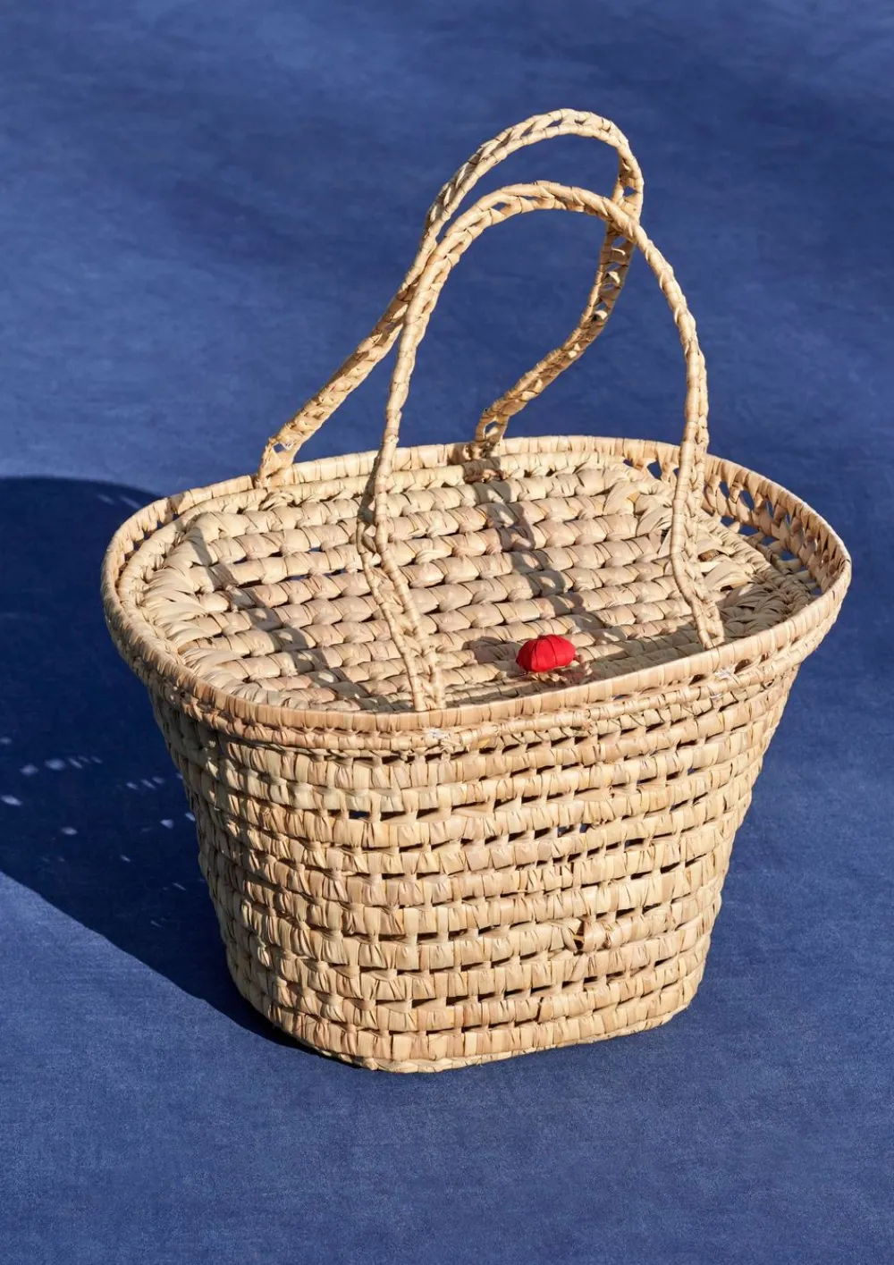Der Sobremesa Market Basket ist Teil einer Design-Kooperation zwischen und der Künstlerin Laila Gohar. Er ist ein geräumiger Korb, mit dem der tägliche Einkauf mehr Spaß macht. Sie ist aus Raffiabast gefertigt und mit einem knallroten Verschluss versehen.