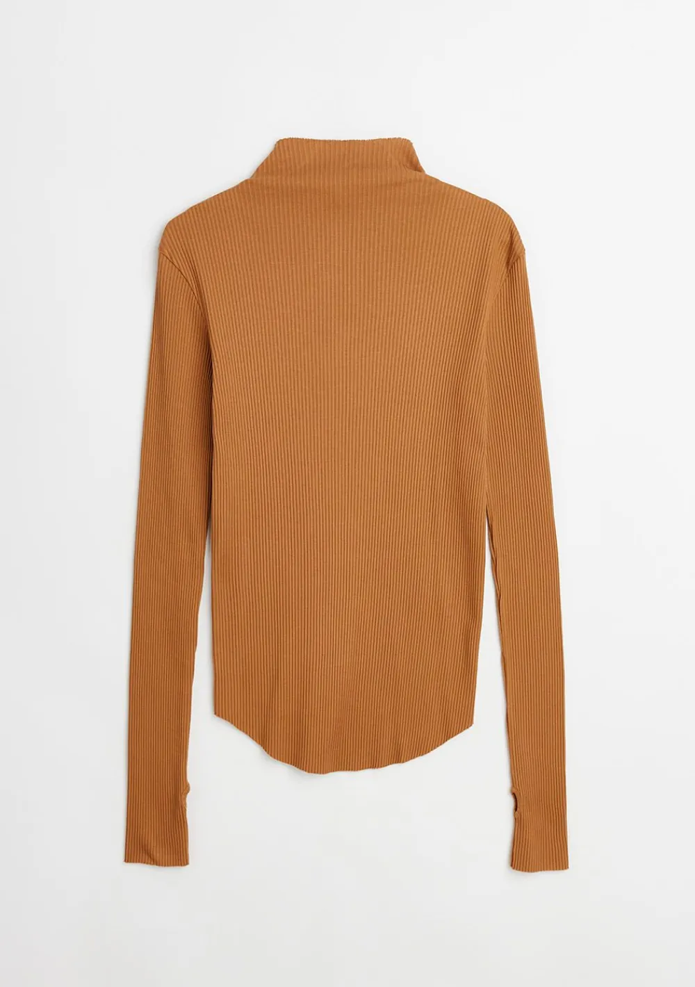Schöner Rollkragenpullover aus gerippter Baumwolle von Swedish . Das Modell ist schlank im Modell, perfekt gestylt mit einem Paar High-Waisted Jeans oder Hosen. Das Modell passt auch perfekt unter verschiedene Strickwaren und Cardigans oder einen Blazer. Ein sehr schönes Modell mit einem einfachen und zeitlosen Schnitt.