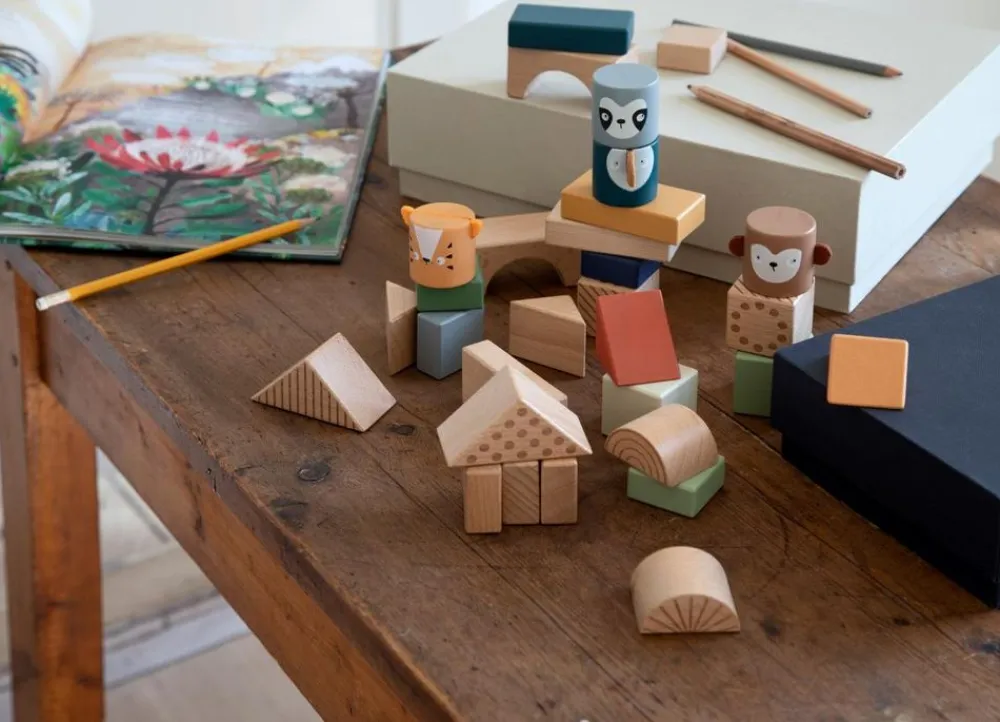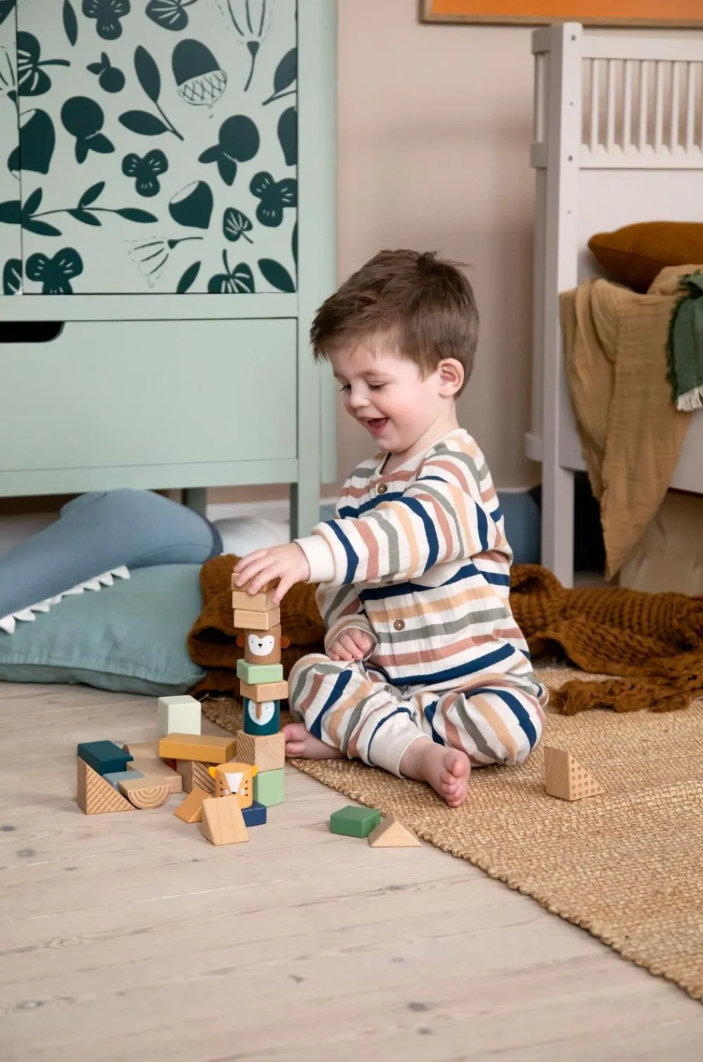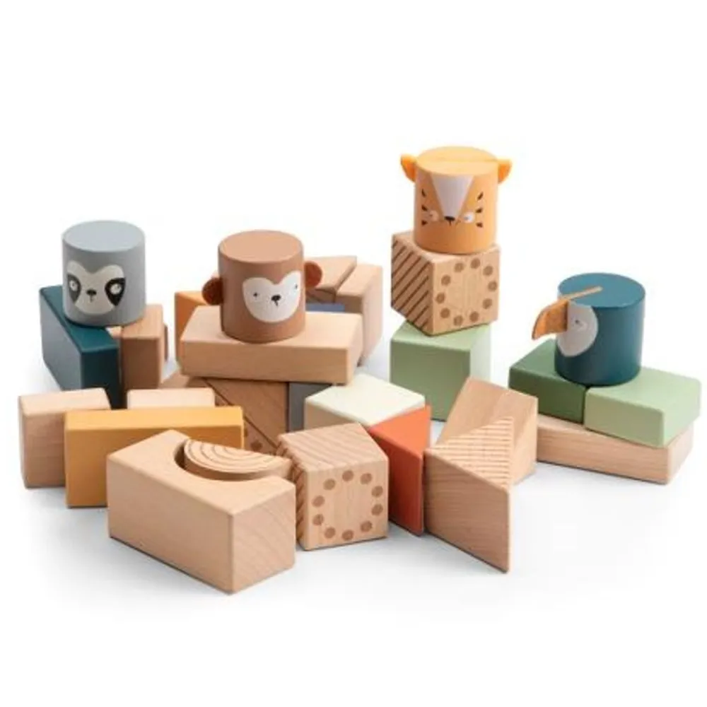 Die normalen und klassischen Bauklötze erhalten durch diese Ausgabe eine schöne Wendung. Das Kind findet nicht nur Quadrate, Dreiecke und Brücken, sondern auch einen versteckten Tierkopf, den es garantiert lieben wird. Mit diesen vier Tierköpfen – Maci dem Affen, Tully dem Tukan, Tupi dem Tiger und Lacey dem Faultier – kann das Kind einen Zoo, ein Tiergehege, Totempfähle und vieles mehr bauen. Bei der Verwendung dieser Blöcke lernt das Kind, die Hand-Augen-Koordination zu entwickeln, insbesondere beim Stapeln der Blöcke in einem Turm oder nebeneinander.