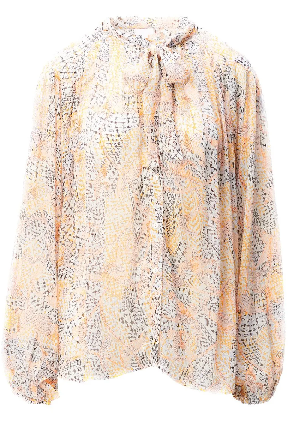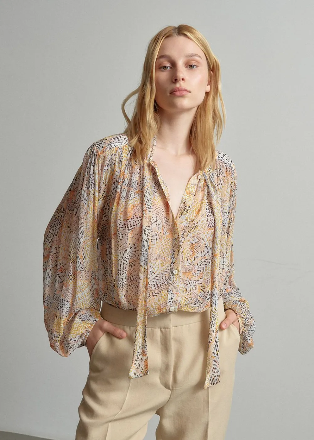 Diese luftig-leichte Bluse von ist der Inbegriff von Frühlingsfreude und Weiblichkeit. Der zarte „Heritage Garden“ Print mischt warme Gelb- und sanfte Grautöne zu einem faszinierenden Muster, das an einen sonnenverwöhnten Blumengarten erinnert.