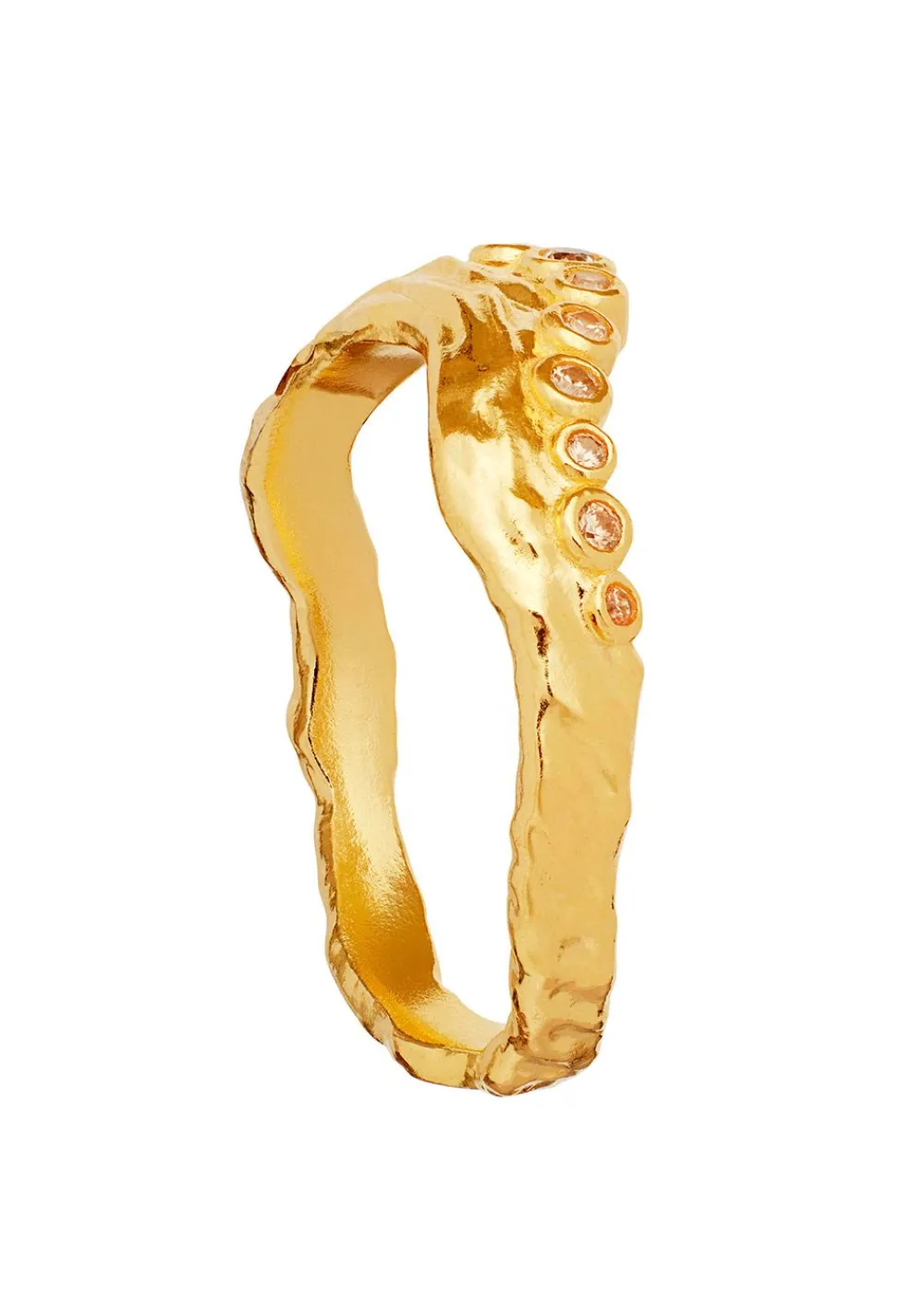 Der Selene Ring von ist eine Hommage an die geheimnisvolle Schönheit und weibliche Energie des Mondes. Die geschwungene Silhouette und die organische Textur sorgen für einen lebendigen und dynamischen Look, während die gefassten Zirkone einen subtilen Glanz von Klarheit und Kraft verleihen. Die wellenförmige Form umhüllt den Finger auf natürliche Weise und unterstreicht die jenseitige Eleganz des Rings.