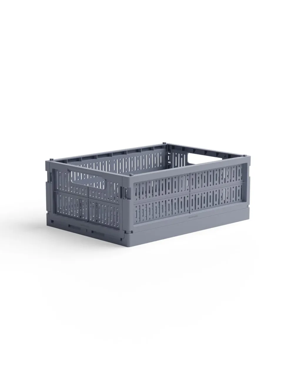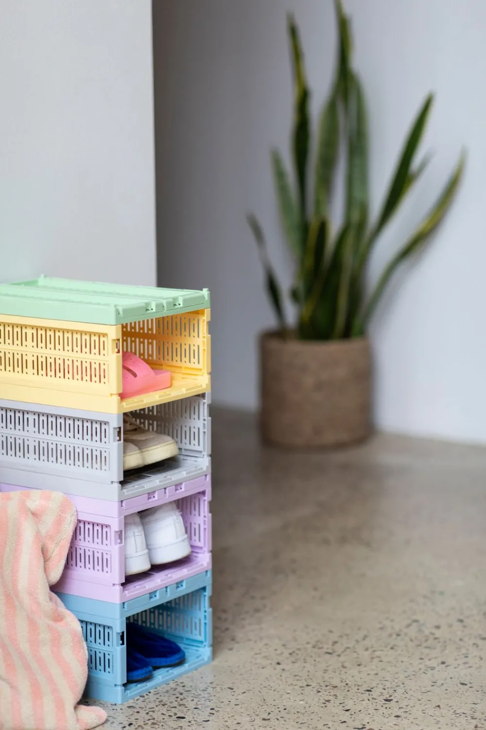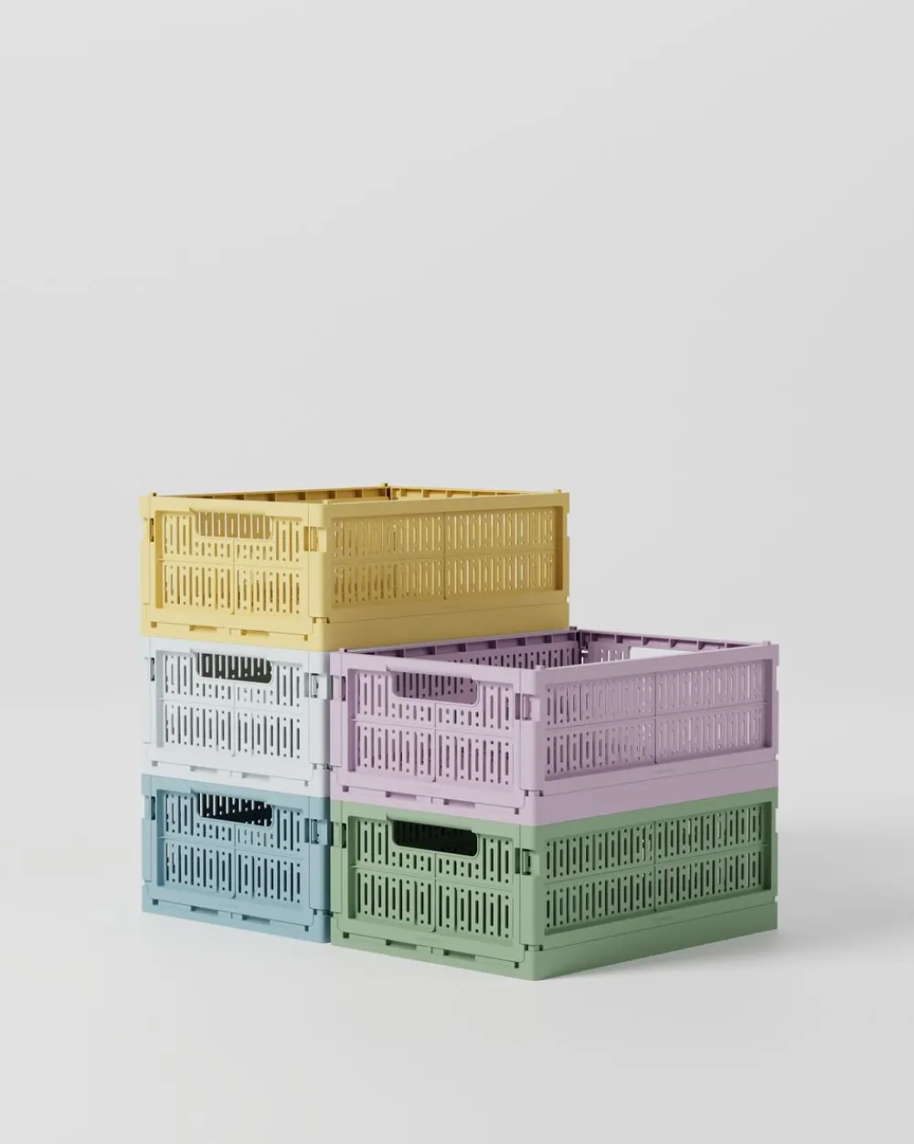 ist eine Reihe von umweltfreundlichen Faltkisten mit einem einzigartigen Design. wird zu 100 % aus recycelten Kunststoffabfällen hergestellt und in Europa produziert und bietet verantwortliche Aufbewahrungslösungen. Diese Kisten sind stapelbar, in drei verschiedenen Größen erhältlich und in einer breiten Palette von leuchtenden Farben verfügbar. Nachhaltig, stapelbar, stilvoll – definiert die Aufbewahrung mit einem grünen Touch neu.