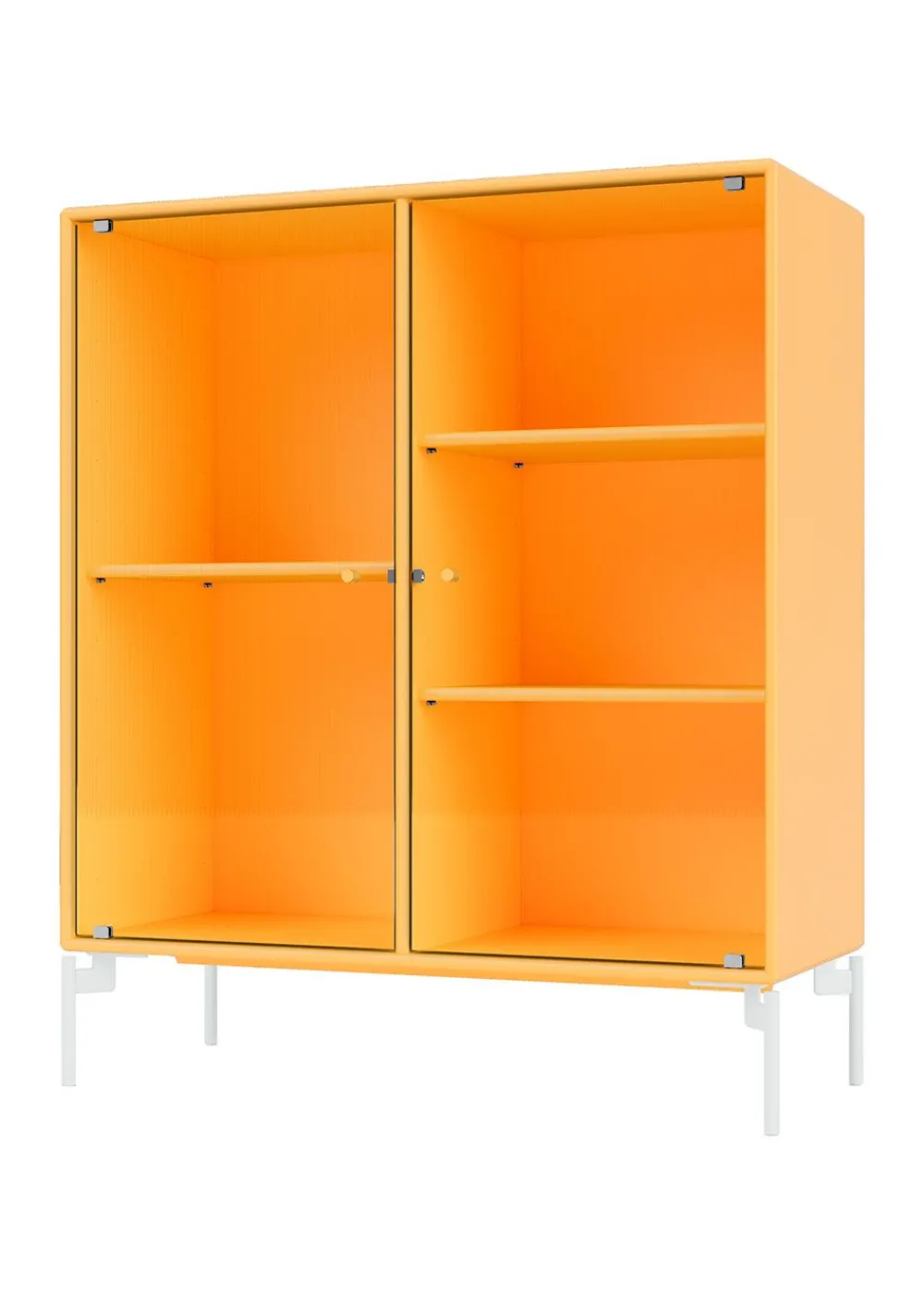 Diese Vitrine wurde mit viel Liebe zum Detail und einem unermüdlichen Engagement für Qualität gefertigt und ist ein Beispiel für modernes Möbeldesign. Seine schlanken Linien werden durch die Wahl der Materialien ergänzt – eine atemberaubende Kombination aus geriffeltem Glas und zarten Farben, die zeitlose Schönheit ausstrahlen.