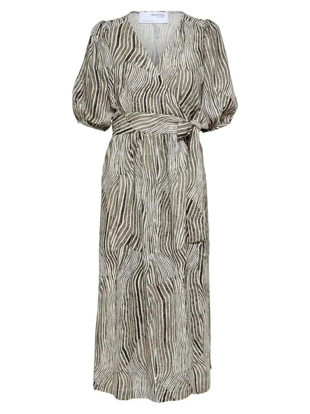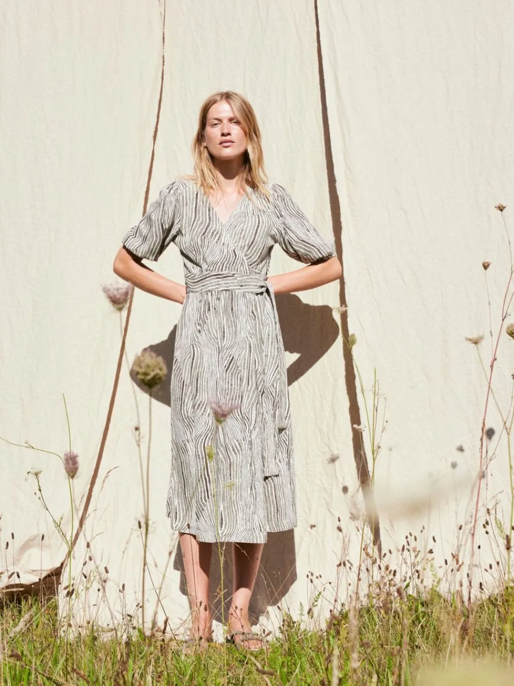Feines Kleid mit Wickeleffekt von . Das Kleid hat einen V-Ausschnitt im geschlossenen Zustand, kurze Ärmel und einen eleganten schwarzen Druck. Die Qualität ist eine leichte und atmungsaktive Viskose und Leinen Mischung, perfekt für die kommende Saison.