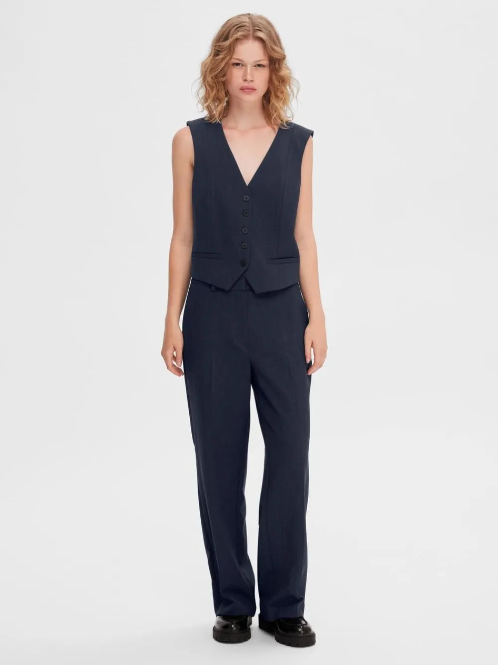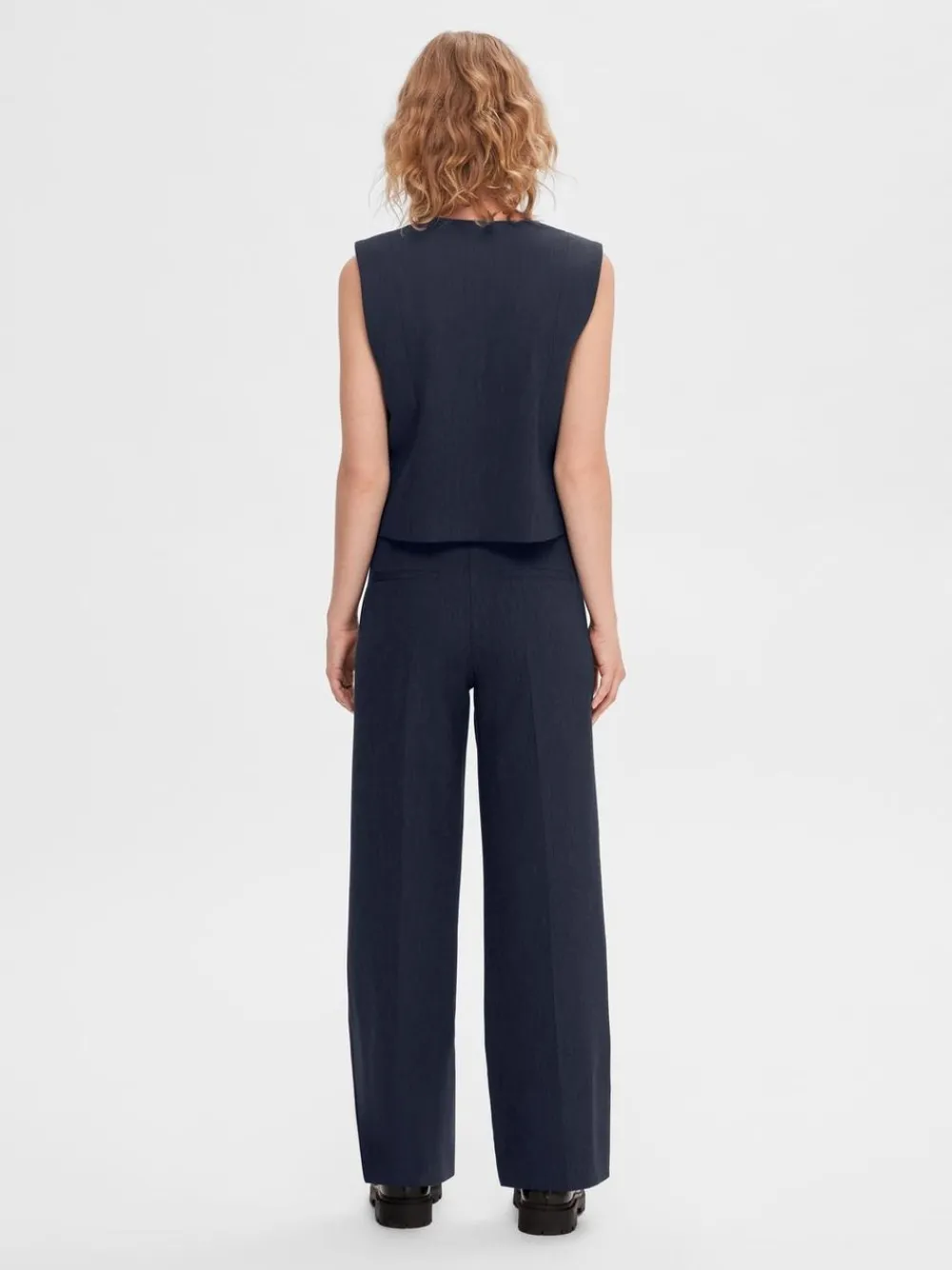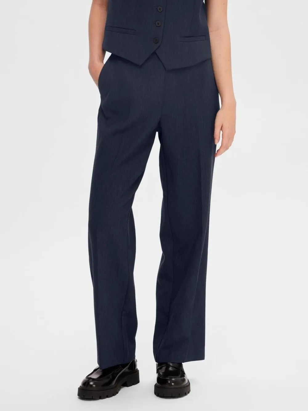 Schöne und einfache Hose mit weitem Bein von . Das Modell hat eine reguläre Taillenhöhe, hat Fronttaschen und einen Verschluss mit sowohl einem Reißverschluss als auch Knöpfen vorne. Hat eine wunderbare Passform, die sowohl im Alltag als auch auf der Party passt. Ein schönes Basismodell für Ihre Garderobe.