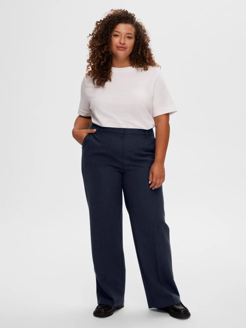 Schöne und einfache Hose mit weitem Bein von . Das Modell hat eine reguläre Taillenhöhe, hat Fronttaschen und einen Verschluss mit sowohl einem Reißverschluss als auch Knöpfen vorne. Hat eine wunderbare Passform, die sowohl im Alltag als auch auf der Party passt. Ein schönes Basismodell für Ihre Garderobe.