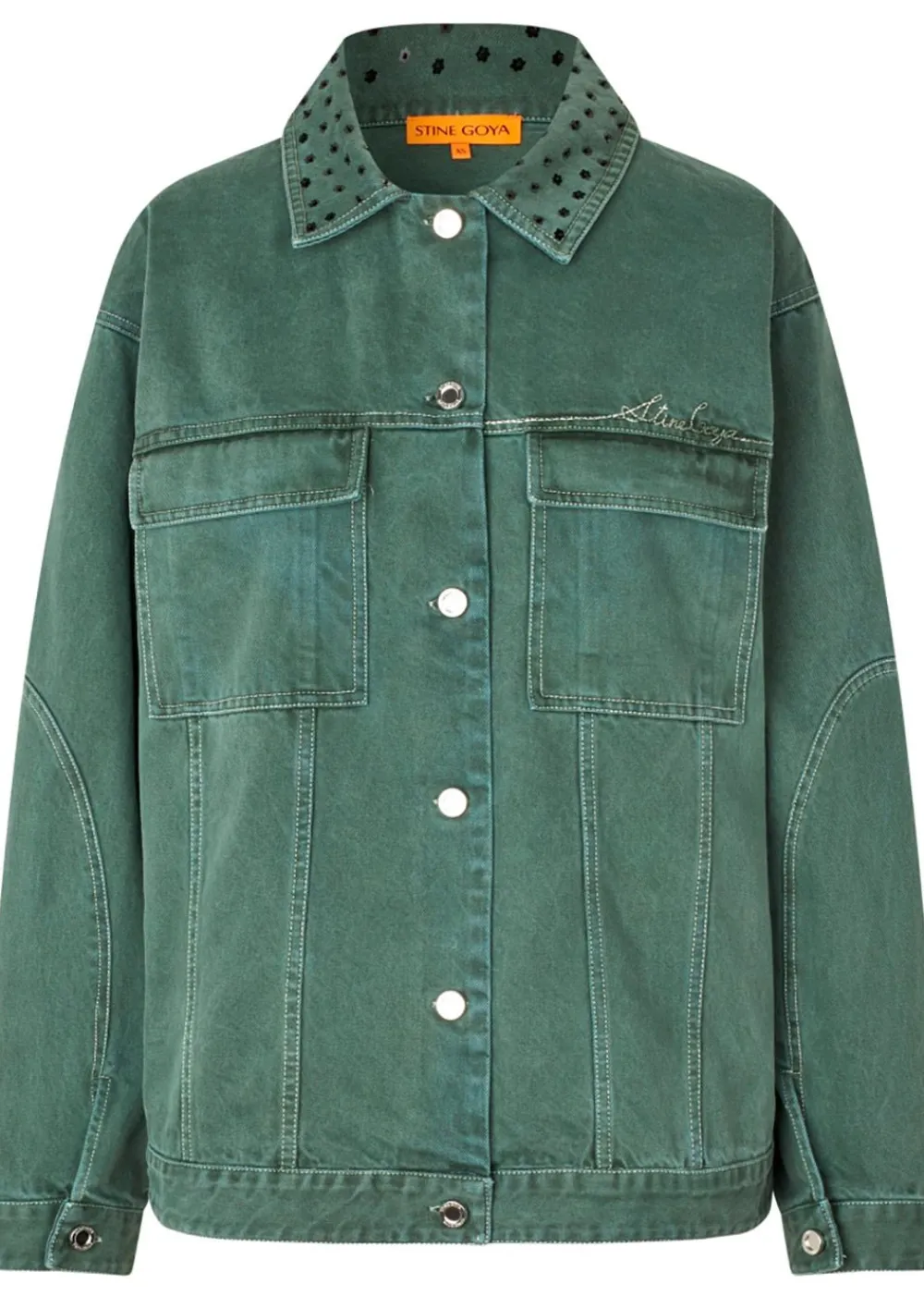 Die Oversized Pockets Jacket von ist eine moderne Interpretation der klassischen Jeansjacke. Die Jacke aus gewaschener Bio-Baumwolle hat eine entspannte, kastenförmige Silhouette mit großen Vordertaschen und Kontrastnähten. Der Kragen ist mit floralen Details verziert, die dem Raw-Look einen femininen Touch verleihen.