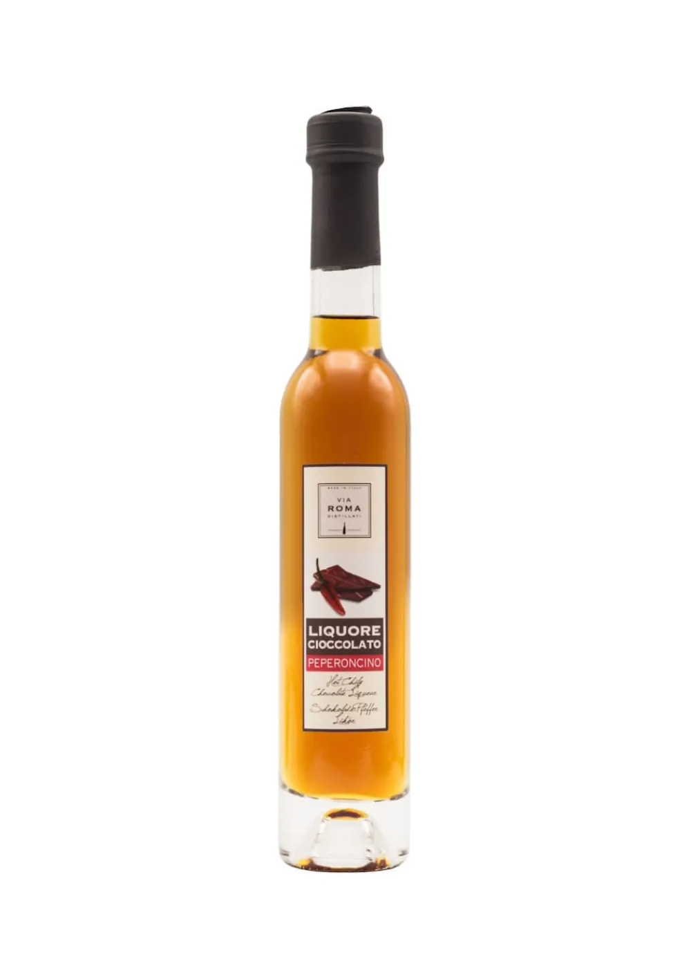Liquore Cioccolato Peperoncino von Via Roma ist ein köstlicher Schokoladen-Chili-Likör mit 25% Alkohol. Er ist voll im Geschmack und eignet sich perfekt für festliche Desserts und alle Schokoladenliebhaber.