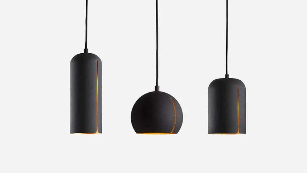 Die Gap Pendelleuchten-Serie wurde von NUR Design entworfen. Das Design kombiniert eine rohe Außenhülle aus pulverbeschichtetem Metall mit einem eleganten messingfarbenen Innenleben, das warm und gemütlich wirkt. Im Lampenschirm befindet sich ein schlanker Spalt, der das Licht entweichen lässt. Dies verleiht der Lampe auch ein schönes Aussehen, bei dem man einen Blick auf den goldenen Schein von innen erhaschen kann.